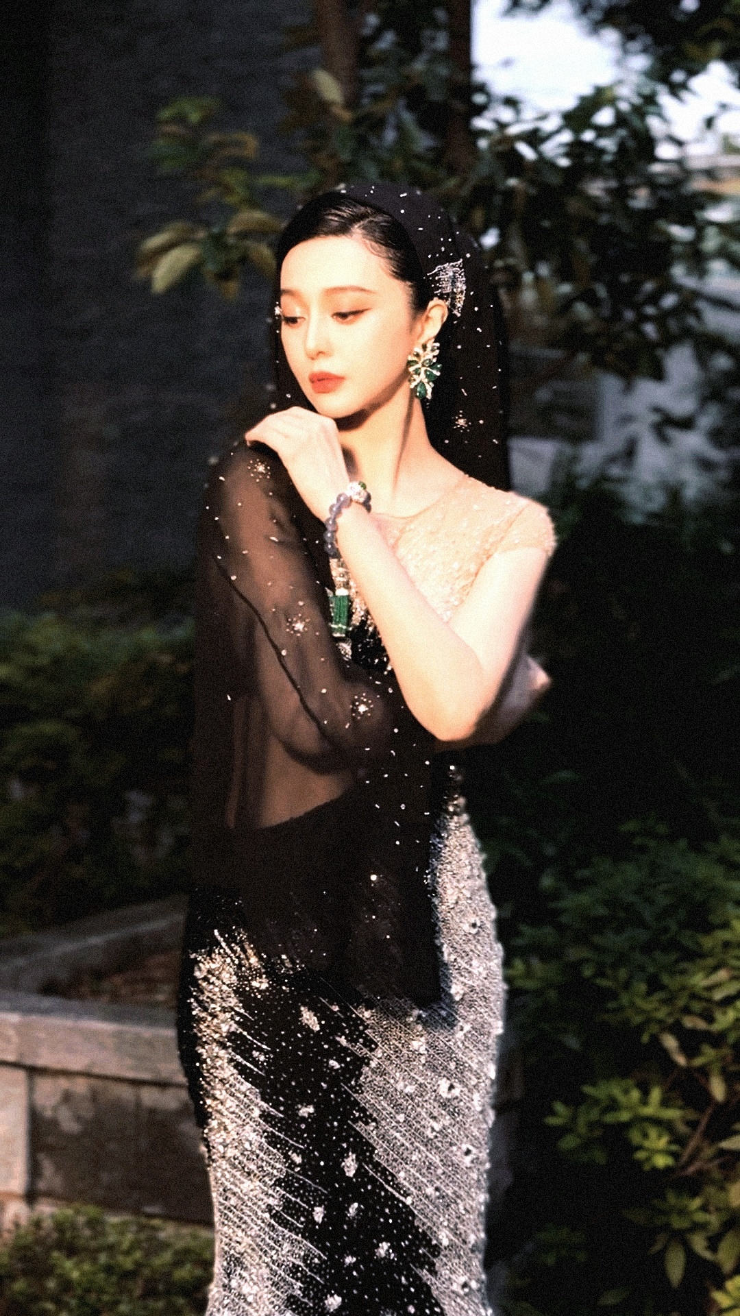 共创之夜美神降临杨幂鎏金长裙太吸睛!裙身缀满细碎水钻,搭配珍珠发箍,走路时裙摆