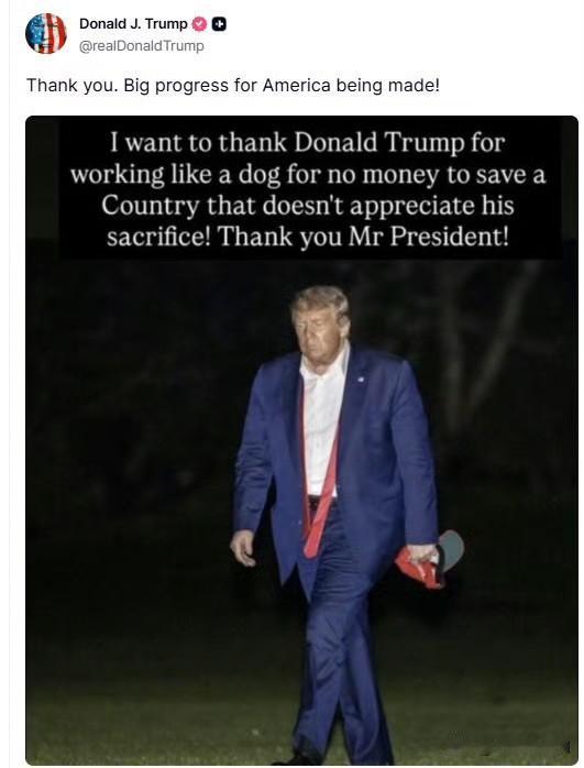 【黄金时代】川普感谢网友对他的感谢 网友: “我想感谢唐纳德·特朗普, 为了拯救一个不懂感恩的国家, 他像条狗一样辛勤工作,却分文未取。 谢谢您,总统先生!” 川普: 谢谢。美国正在取得巨大进步!
