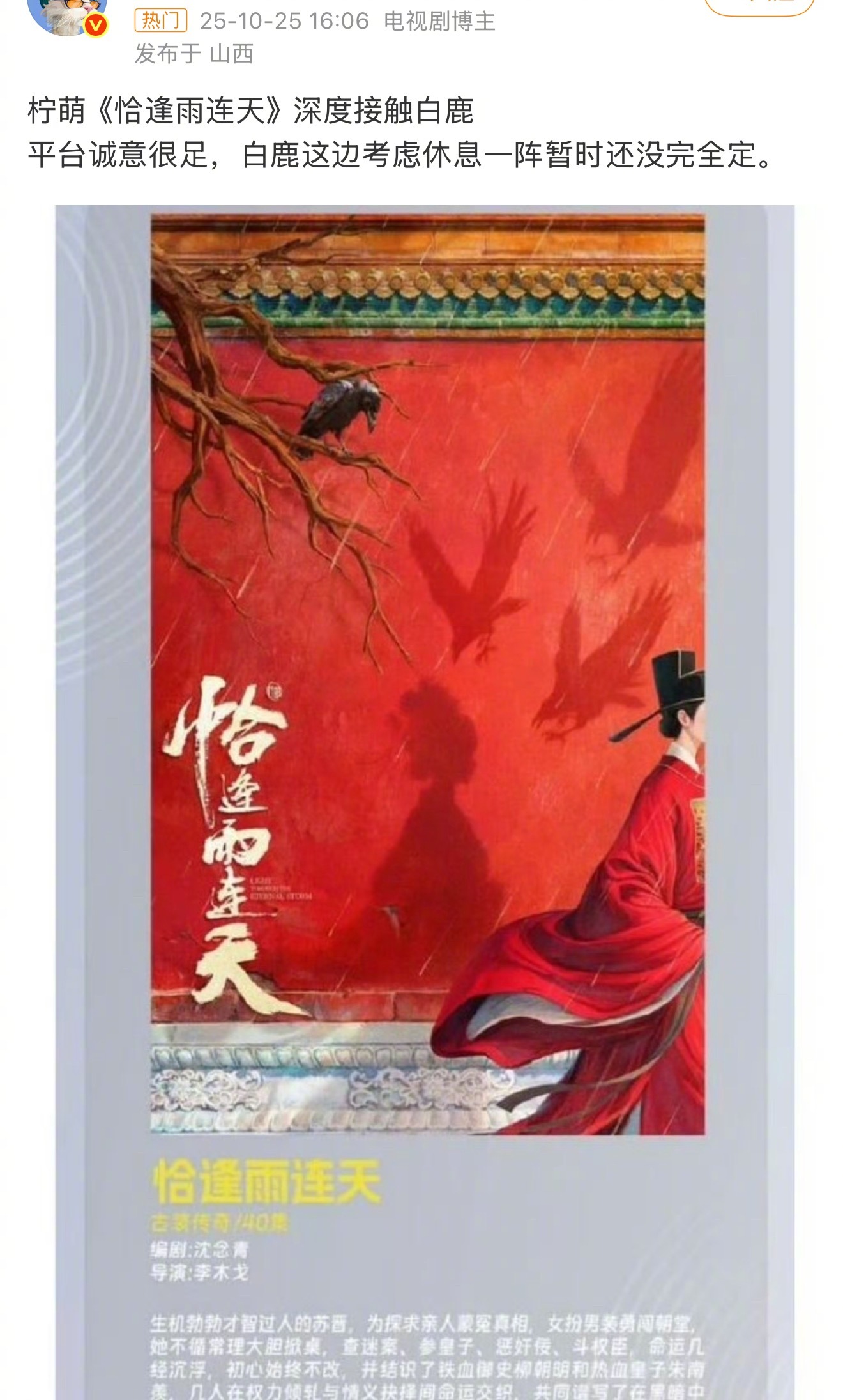 虞书欣有新饼了,柠萌的《恰逢雨连天》,这部戏之前不是说深度接触白鹿吗?被虞书欣截胡了?