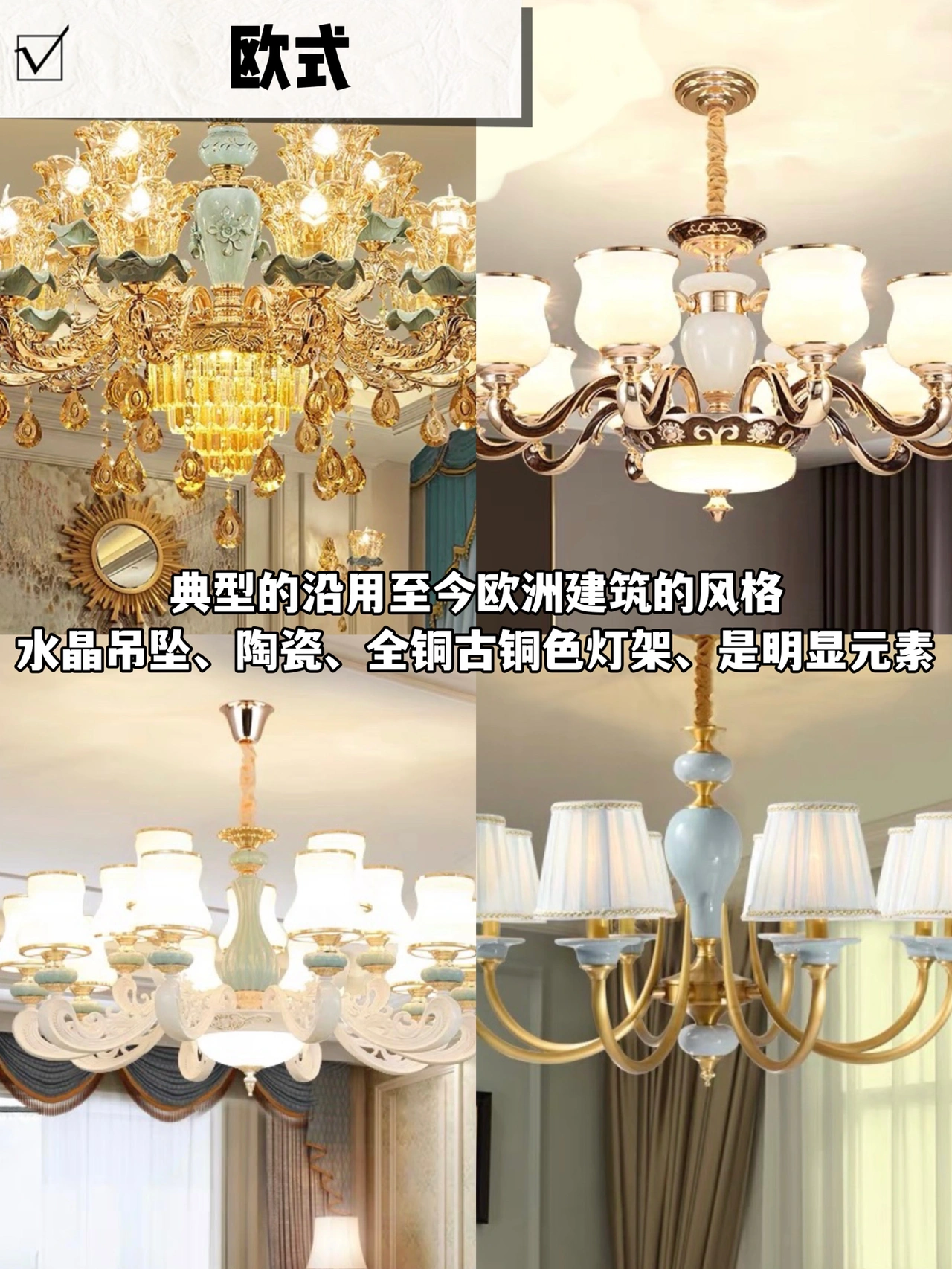 特征:典型的沿用至今欧洲建筑的风格,欧式吊灯较明显,水晶吊坠、陶瓷、全铜古铜色灯架、是明显元素