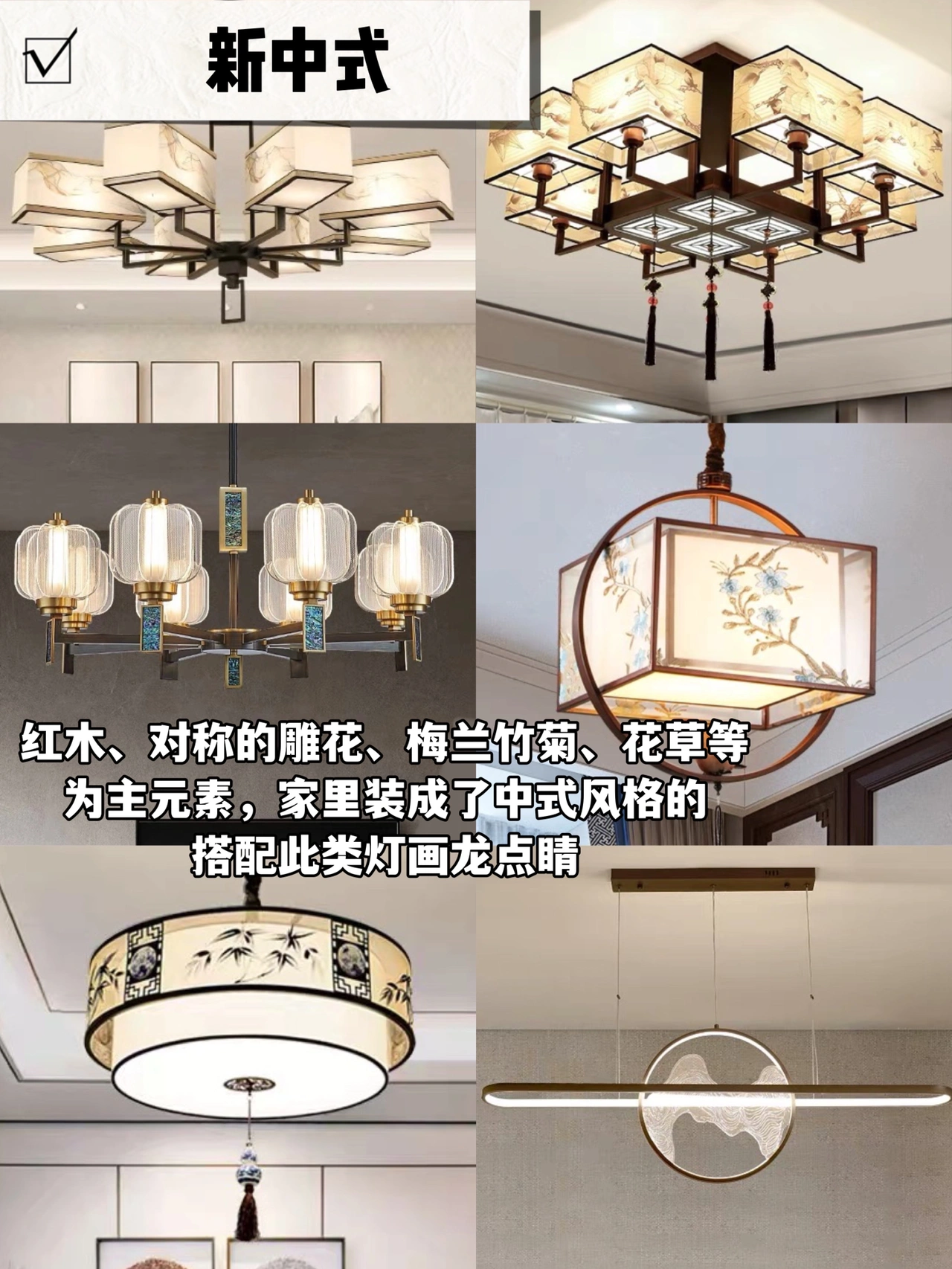 特征:顾名思义中式风格,红木、对称的雕花、梅兰竹菊、花草等为主元素,家裡装成了中式风格的,搭配此类灯画龙点晴