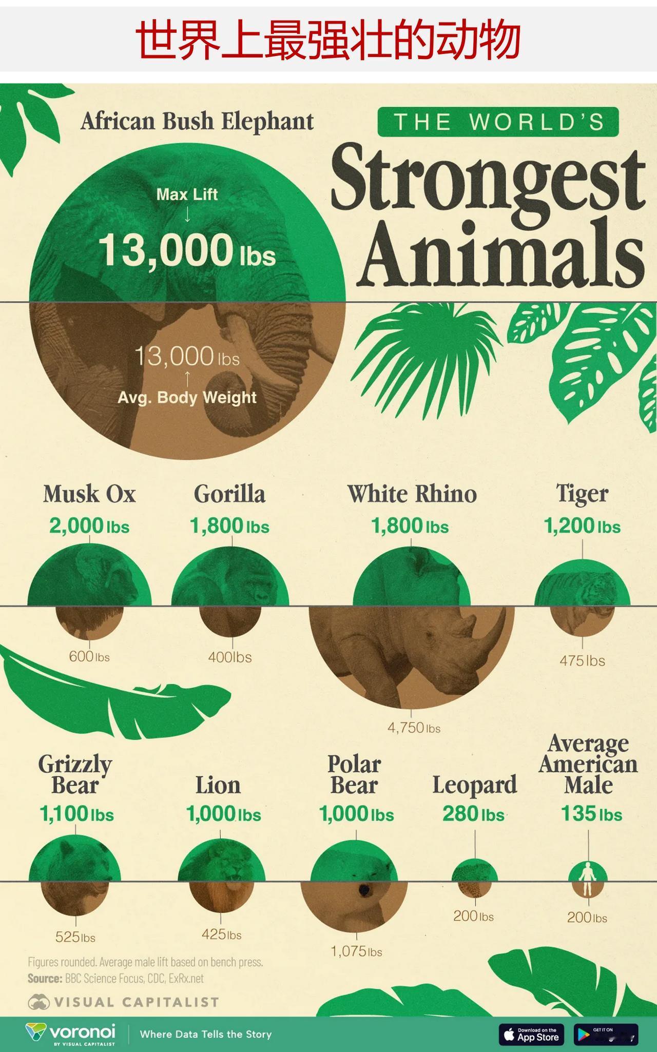 世界上最强壮的动物是什么? 动物界展现了一些令人惊叹的强者典范,其中不同的物种通过进化出特殊的肌肉结构、身体运动方式以及杠杆作用等方式来实现生存。 在这幅图表中,根据动物所能举起的最大重量对全球最强壮的动物进行了排名。 此图表所使用的数据来源于《BBC Science Focus》。为了提供背景信息,图表中还包含了普通美国男性在卧推测试中所能达到的最大举重量。 ——大象:大自然的大力士 非洲丛林象在力量方面表现尤为突出。它能够举起 13000 磅重的物体,相当于一辆小型校车的重量,是现存最强大的陆地动物。 大象的鼻子内含有多达 40,000 块肌肉,这使得它们既能完成精细的动作,如挑起一根小草,也能完成强大的动作,比如连根拔起树木。 大象也是世界上寿命最长的哺乳动物之一,不过它们的寿命比人类要短。 ——大型猫科动物和大猩 在食肉动物中,老虎堪称最为强壮的掠食者。它能够举起超过自身体重两倍的物体,并且在捕猎时采用迅猛的动作。 尽管大猩猩主要是食草动物,但它们的力量却能与大型猫科动物相媲美:它们的上半身肌肉能够举起超过 1800 磅的重物。 与人类相比,大猩猩的肌肉纤维更为密集,手臂也更长,骨骼也更粗壮。 ——相对最强壮的动物 虽然这种屎壳郎无法举起 1000 磅重的物体,但从相对的角度来看,它却是世界上最强壮的动物。 这种以粪便为食的动物几乎遍布全球各个地区,可以举起 40 磅的重量,相当于自身体重的 1100 多倍。