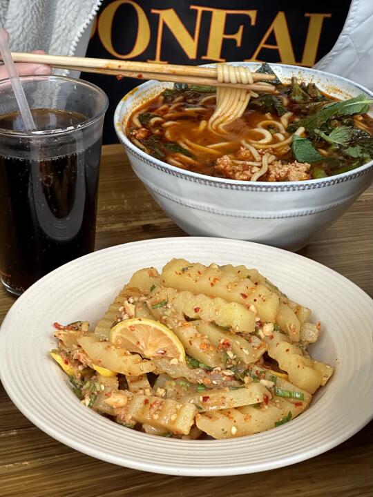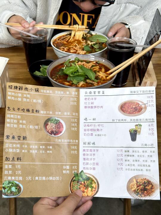 很适合一两个人去吃的小店,路过真的不容易发现…可选择的不多,但是都是云南味道!!两个人点了鲜肉小锅米线和饵丝+傣味土豆,吃到的时候真的觉得好幸福!!