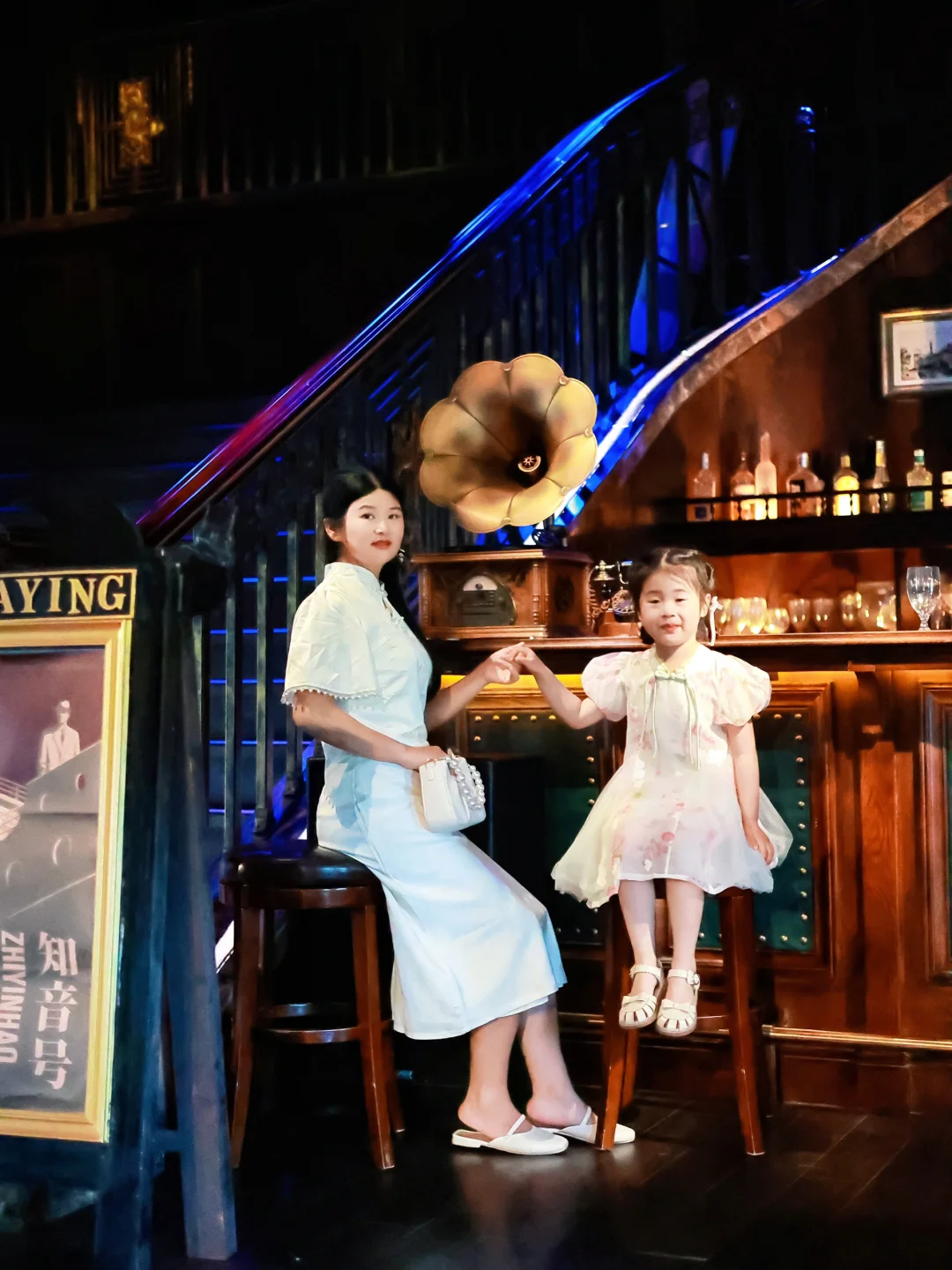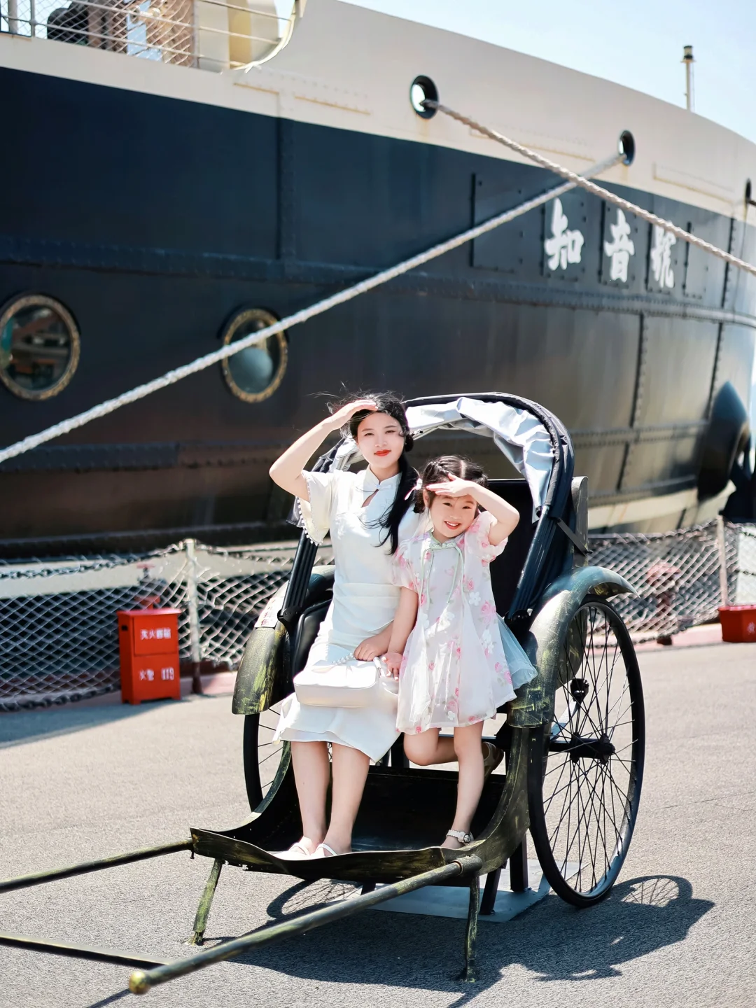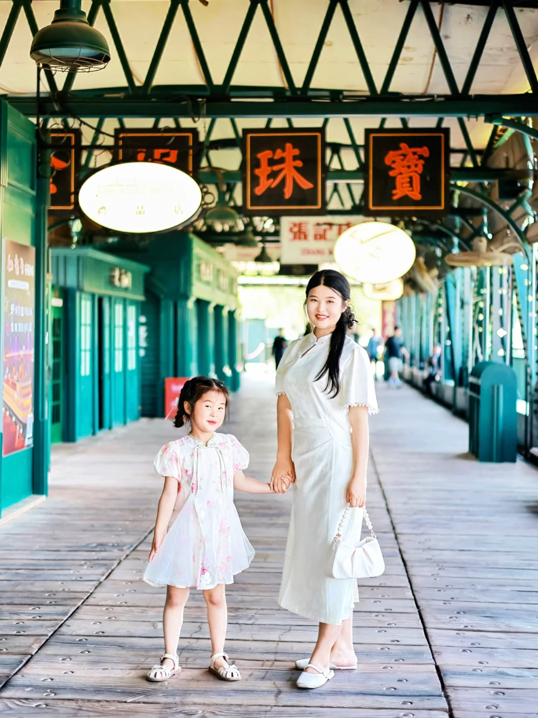 也可以跟女鹅穿浅色系的亲子旗袍,码头门口也有服装租赁,有各种复古旗袍衣服可以选择!