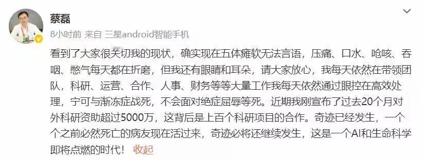 蔡磊进入渐冻症晚期:全身仅眼球能动,起身需3人同时扶,喝水靠针管,研发的药物对病友起效对自己没用 曾经风风火火的京东副总裁,如今只剩眼珠子会转。护工小张说,蔡总早上想睁眼,得先让眼皮“热身”十秒,像生锈的铁门,吱呀一声才拉开缝。三个大小伙子把他从床上搬到轮椅,同步喊“一二三”,稍有差池,整个人就像面粉袋一样塌下去。喝水更省事,拿根给猫打针的小针管,沿着嘴角一滴一滴推,稍快一点就能呛到满脸通红。可就算这样,他还是让助理把电脑架在眼皮底下,用“眼控仪”敲字——屏幕键盘一格一格跳,他盯着两秒等于“点击”,一分钟能打出八个字,比幼儿园小孩手写都慢,他却说:“够用,能回邮件就行。” 很多人纳闷,药呢?不是砸了几个亿搞试验吗?现实比电影残酷:同样一款在别的病友身上显出延缓效果的组合药,到他这儿像白糖水,指标该升升、该降降,肌肉还是一天一两地掉。医生私下摇头:“蔡总属于超极速型,免疫系统太亢奋,反把药效吃了。”一句话,运气背到脚底。他听完咧嘴笑,声音像破风箱:“我当一回对照组,也算贡献。”转头让团队把数据打包上传,谁想用随便拿,分文不收。 我去年夏天去探望,正赶上他开“线上路演”。镜头里,眼球左右晃,PPT自己翻页,讲的是“渐冻症多组态药物筛选平台”,口水顺着下巴滴到领结,护工一边擦,他一边把十四家投资机构的名称背得一字不差。讲完问答,有人试探问:“蔡总,若资金到位,您个人能撑到临床吗?”屏幕那端沉默几秒,眼控光标移到一行字:“也许来不及,但来得及救别人。”那一刻,我鼻子比空调还酸。 晚上他留我吃食堂,菜谱是“针管小米粥+打成糊的西兰花”。护工把食物装进医用推注器,像给汽车加机油,边推边聊天:“蔡总规定,自己用剩的药、多余的耗材,全部捐给病友群,连这包胃管都写了名字,谁急用谁来领。”我问他图啥,他眨眼三下,等于“确认”,助理代为回答:“他说自己当过高管,知道资源错配的痛,只剩眼球也能做物流,只不过现在运的不是快递,是命。” 外界声音很撕裂。有人夸他是“药神”,也有人冷嘲“砸钱买名”。我翻出早期报道对比,同样这批人,两年前还在点赞“企业家良心”,如今病症进入晚期,口吻却变成“早知没用,不如捐款给希望小学”。网络时代,键盘敲得比心跳快,善意常被流量牵着跑。蔡磊倒看得开,让助理把骂他的截图打印出来,贴在床头,“当醒脑口香糖,比风油精还管用”。 其实最大争议是“烧钱赌命”。几个亿投进去,只换来少数病友延缓半年,性价比似乎惨不忍睹。可业内人告诉我,罕见药研发向来九死一生,若无“显眼包”先砸钱、扛雷、走夜路,后面资本根本不敢跟。蔡磊像一盏车头灯,照见坑坑洼洼,自己碾过去,后面才有药企敢踩油门。换句话说,他花的是自己的银子,铺的是公共的路,值不值,得让时间算总账。 夜里十一点,护工给他翻身,防褥疮。我凑近道别,他眼球转两下,示意我俯身,用那台眼控仪慢慢拼出一句:“别写惨,写希望。”我点头,却差点没绷住。回家路上,耳机里循环他最爱的《平凡之路》,忽然明白:希望不是治愈,而是把“可能”留给后来人。哪怕他赶不上,也要让下一班车准点出发。 渐冻症仍无解,但因为他,解题的人多了,钱来了,数据厚了,政策也倾斜了。或许有一天,新药上市,说明书不良反应栏里,会藏着一行小字——“本试验数据由蔡磊团队提供”。那时,他也许只剩名字,但足够让病友在深夜读到,轻轻说一句:“老蔡,没白干。” 各位读者你们怎么看?欢迎在评论区讨论。