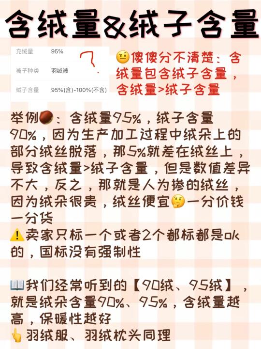 📖我们经常听到的【90绒、95绒】,就是绒朵含量90%、95%,含绒量越高,保暖性越好👈羽绒服、羽绒枕头同理