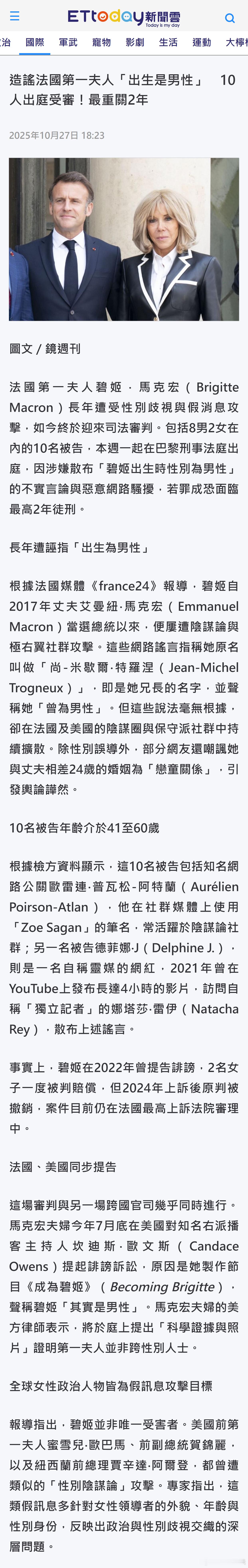 台媒:造谣法国第一夫人「出生是男性」 10人出庭受审!最重关2年