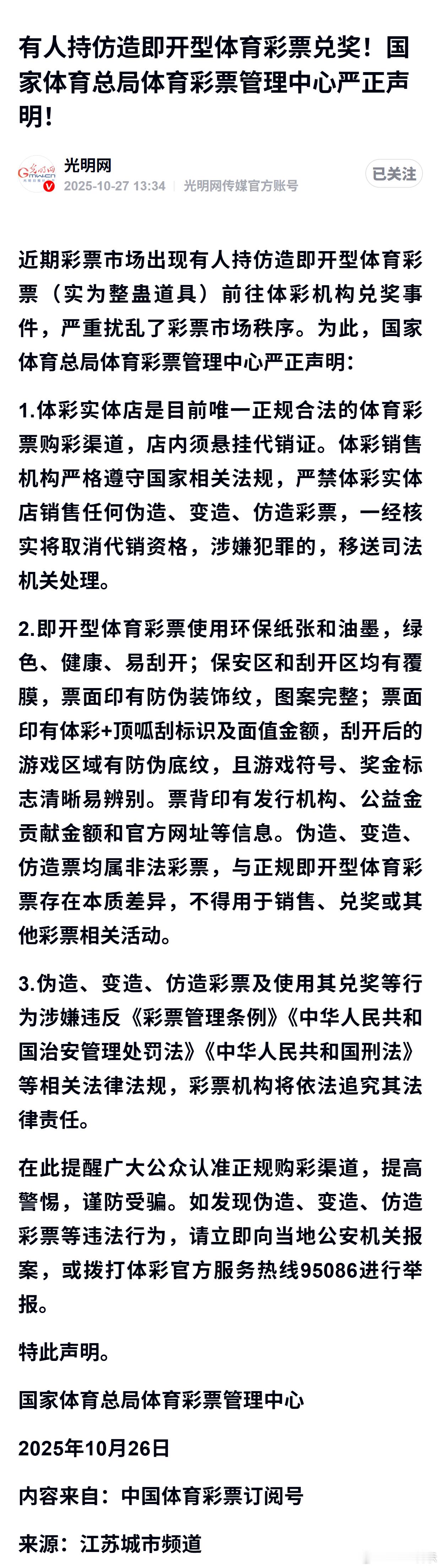 有人持仿造即开型体育彩票兑奖!国家体育总局体育彩票管理中心严正声明!