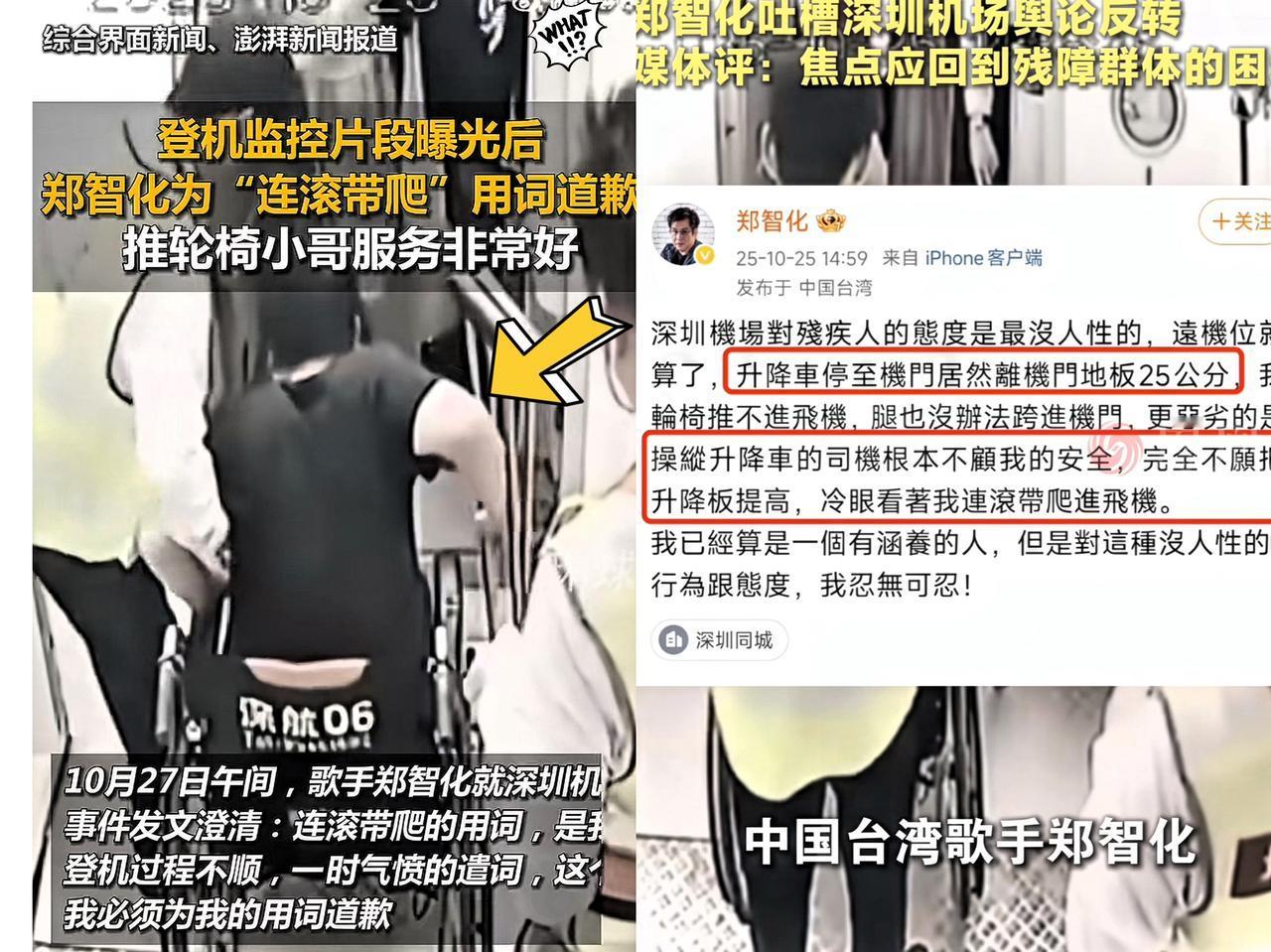 郑智化一觉醒来懵了! 他怎么也想不到,坐个飞机而已,竟然被人扒了老底,18年前 发的旧微博文章,那字里行间,对歌迷和路人满满的蔑视! 机场这事儿,他说自己“连滚带爬”登机,大骂服务“没人性”。可监控一曝光,全露馅了 20厘米高度差符合安全规范,还有俩工作人员一路搀扶,哪有什么“冷眼旁观”。 再看旧微博,他把觉得他严肃的歌迷骂成“小鼻子小眼睛的市井小民”,还标榜自己是“文化人不是卖笑的”! 但没歌迷支持,哪来发声的资本?他为残障群体说话本是好事,可夸大事实,只会消耗公信力。 依我看,公众人物手握话语权,可不能当成情绪发泄的工具。只有真实,才是站稳脚跟的底气。 大家说,公众人物该怎么用好自己的话语权呢?