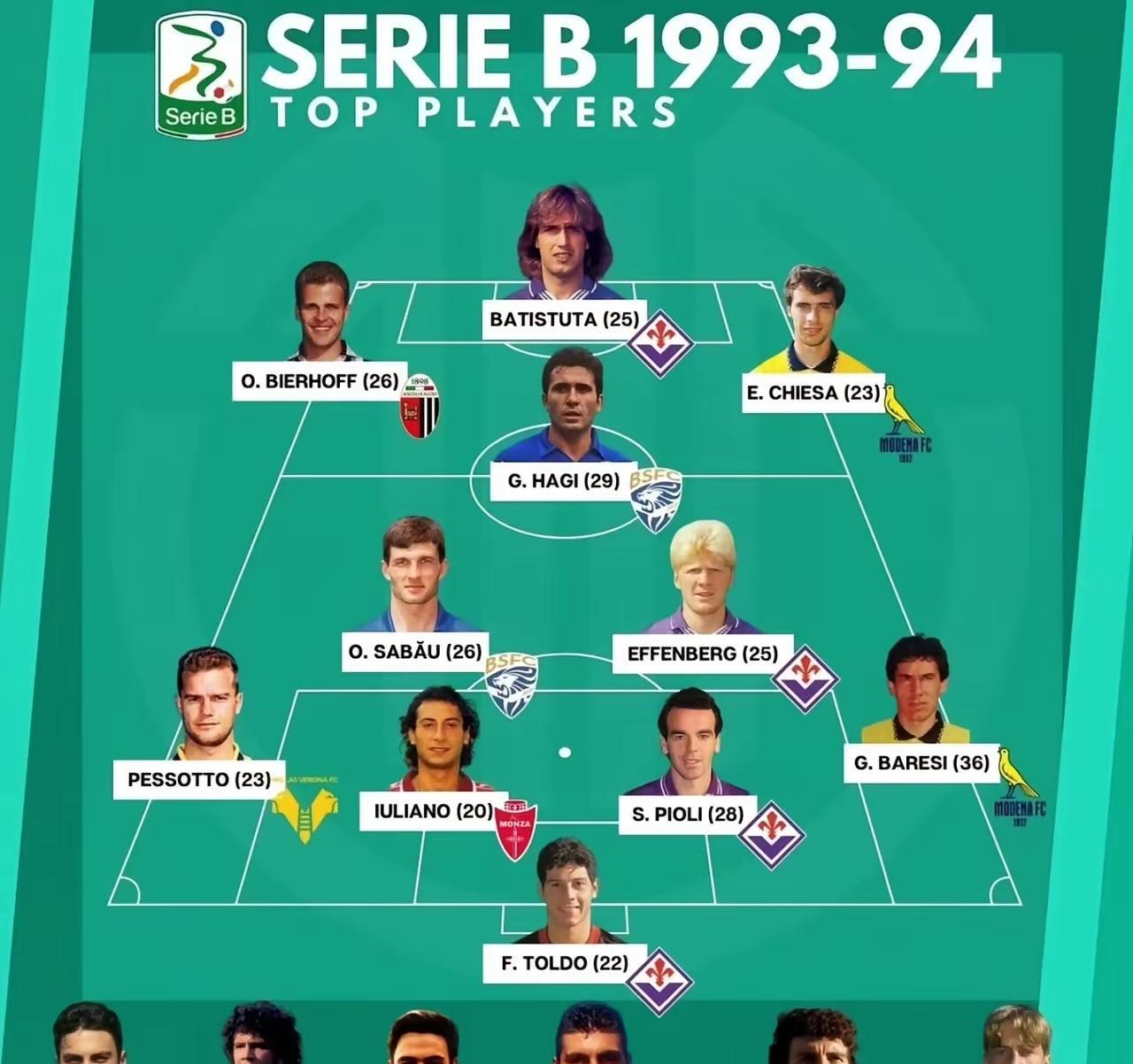 看完94年的意乙最佳阵容和替补,你会明白当年的意甲有多强、多火! 前锋:比埃尔霍夫、巴蒂斯塔、基耶萨! 中场:沙巴奥、哈吉、埃芬博格! 后卫:巴雷西、佩索托、皮奥利(光头教练)、尤利亚诺! 门将:托尔多! 替补:费奥雷、大因扎吉、维耶里、胡布内尔、托马森、安布罗西尼! 对70、80后的球迷来说,上面绝大部分的球员都是耳熟能详的球星,而他们当时却在踢意乙,可见当时的意大利职业联赛有多火,说是球员圣地也不为过! 对比现在英超,当年的意甲更火吧,几乎汇聚足坛60%以上的优秀球员!