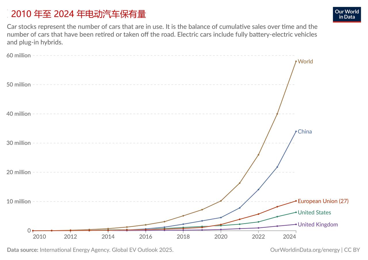 目前道路上有多少电动汽车? 道路上的电动汽车数量(保有量)是历年销售总量的累加值(减去已下线的车辆数量)。 电动汽车保有量总数如下面的图表所示。2024年全球投入使用电动汽车总计约 5800 万辆,而且这一数量还在迅速增加。而在 2022 年,这个数字仅为 2600 万。电动汽车增长量主要来自中国。 在全球使用的5800万辆电动汽车中,其中中国3400万辆,欧盟27国1020万辆,美国630万辆、英国217万辆。