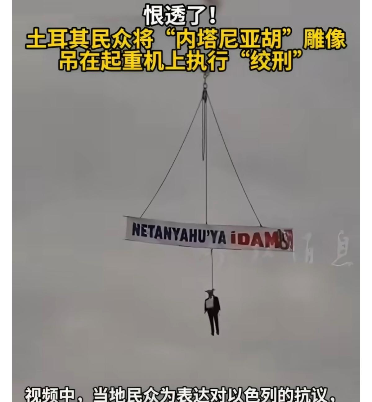 连自己的盟友都恨透了内塔尼亚胡!西班牙街头张贴了内塔尼亚胡身着纳粹军装、佩戴纳粹徽章的海报,西班牙人用这种极具冲击力的方式, 表达对以色列轰炸加沙、封锁加沙、致使巴勒斯坦遭遇人道主义危机的愤怒。 还有更狠的,愤怒的土耳其民众将内塔尼亚胡的塑像用起重机高高吊起在土耳其街头执行绞刑示众。 内塔尼亚胡为以色列铁了心挑战世界良知,不惜以世界人民为敌。将来是上天堂还是下地狱已经置之度外,也算条汉子!
