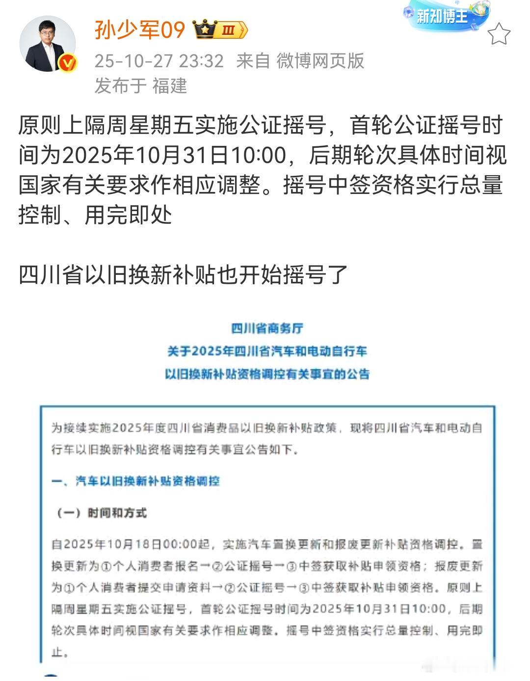 孙少军:四川省以旧换新补贴也开始摇号了​​! 首轮公证摇号时间为2025年10