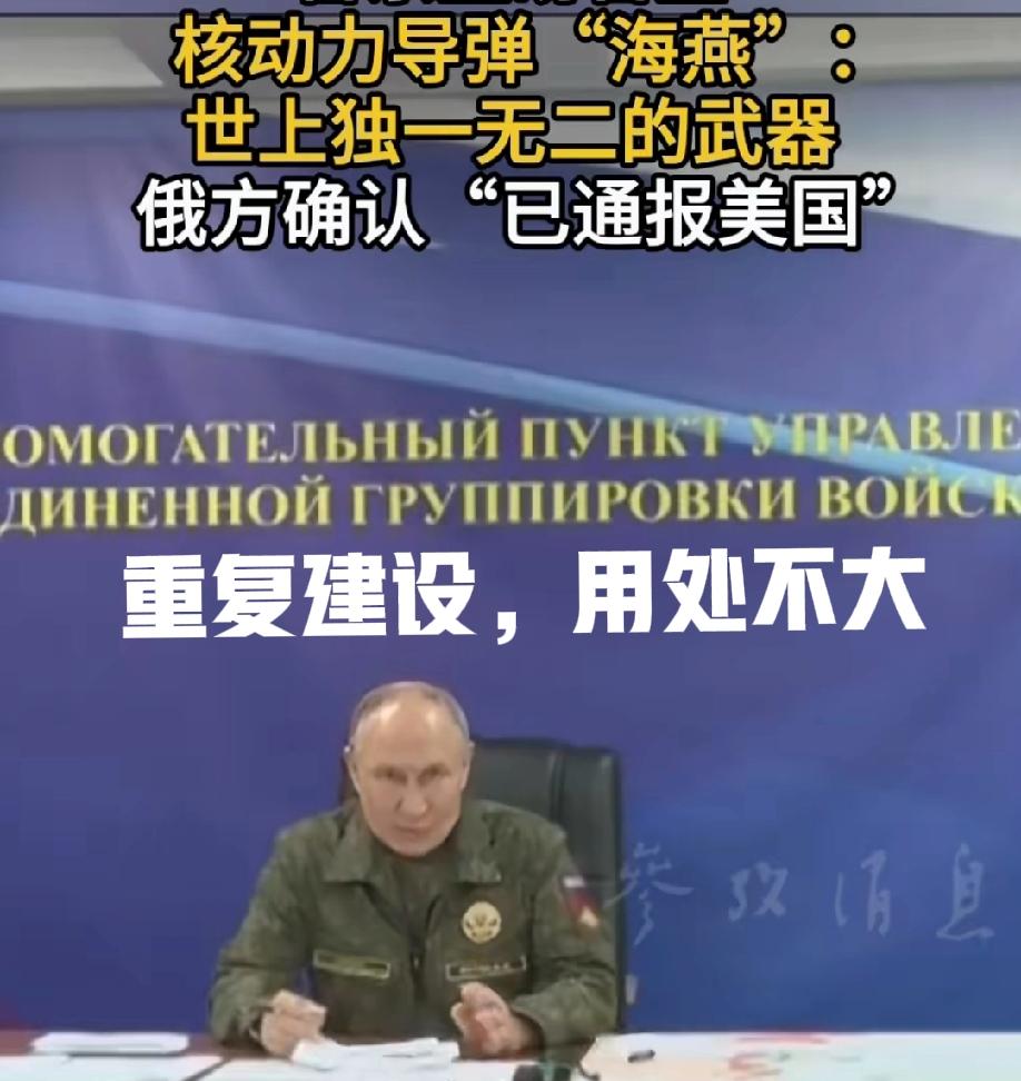 重复建设用处不大! 俄罗斯现在需要的,是常规武器,而不是核武,他的核武威慑力足够,再造一个核动力核导弹,重复建设。就算它一年都在飞行,在太空,不是还只是威慑吗?用的时机在哪里呢? 况且现在的导弹,都是半小时全球覆盖的,不差那几十秒吧! 俄罗斯现在最大的问题是常规武器落后,落后的厉害,使用的武器都是前苏联研制的,服役的,在现代化,信息化的方面,差的远,在前线,已经在用摩托车冲锋了! 这是个人观点: