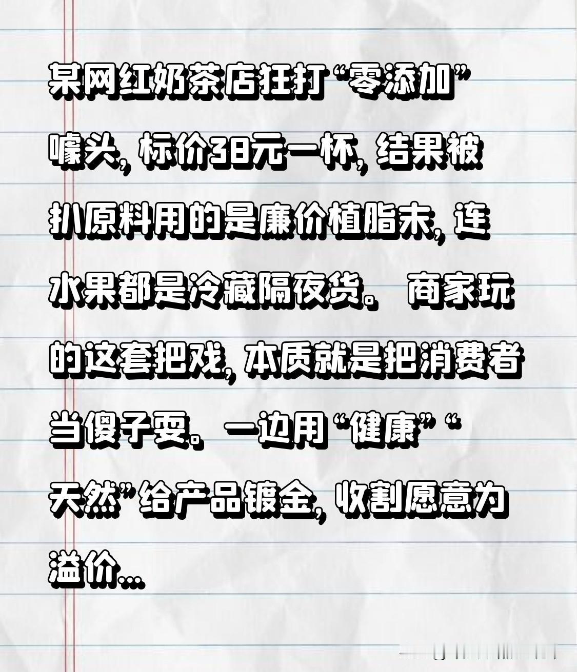 某网红奶茶店狂打“零添加”噱头,标价38元一杯,结果被扒原料用的是廉价植脂末,连水果都是冷藏隔夜货。 商家玩的这套把戏,本质就是把消费者当傻子耍。一边用“健康”“天然”给产品镀金,收割愿意为溢价买单的人;一边在看不见的地方偷工减料,成本可能连售价零头都不到。更讽刺的是,出事后商家只轻飘飘发个“误会”声明,连句正经道歉都没有。 现在很多网红店都这德行,营销比产品用心,包装比内容实在。消费者不是不能接受贵,但花了高价,买的至少得是货真价实的东西,而不是一堆虚假宣传的泡沫。 你们有没有踩过类似的坑?遇到这种挂羊头卖狗肉的商家,是认栽算了,还是会较真维权?