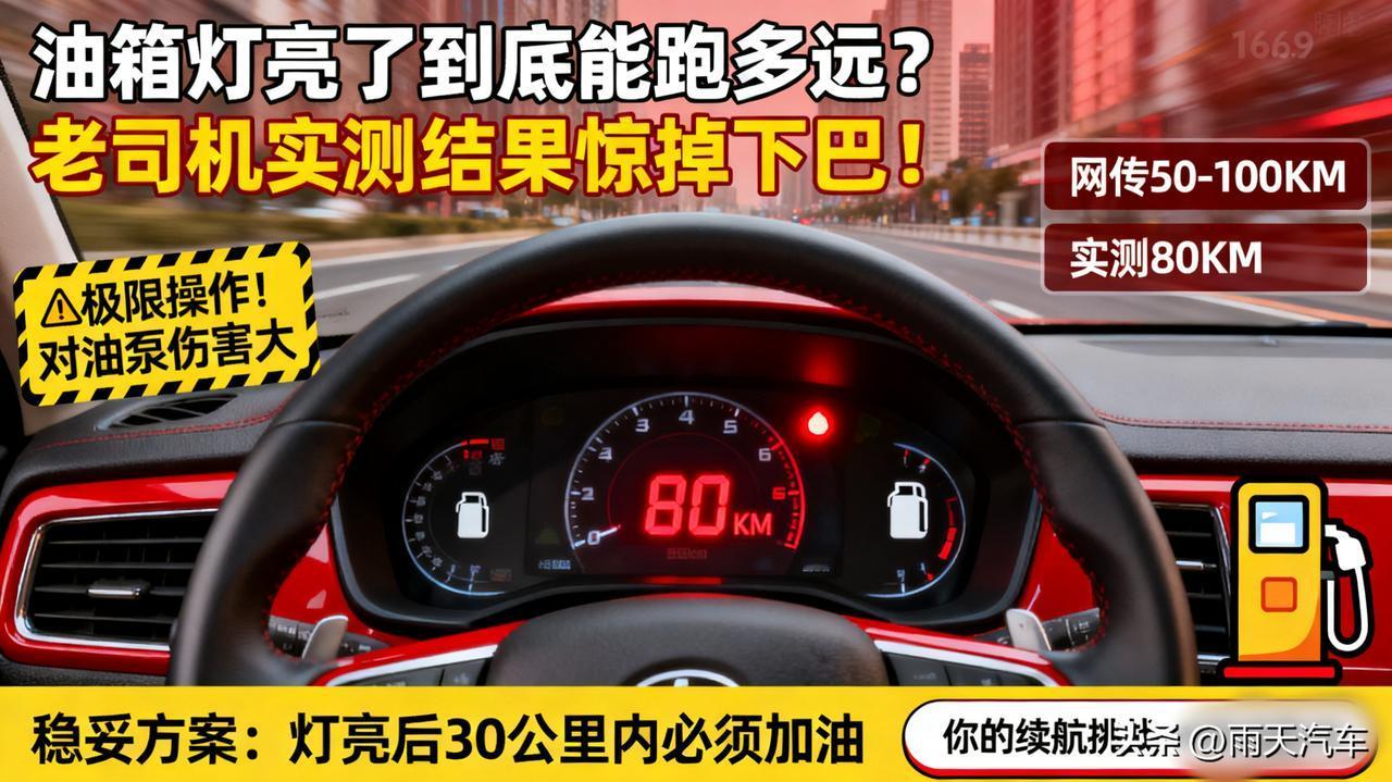 油箱灯亮了到底能跑多远?老司机实测结果惊掉下巴! 昨天开车,油箱灯突然亮了,心里一慌!赶紧靠边查资料,结果老司机们的说法五花八门。有说能跑50公里的,有说能跑100公里的,这差别也太大了吧! 我硬着头皮实测了一下,在市区综合路况下,我的这台合资SUV,灯亮后居然跑了将近80公里才彻底趴窝!不过这可是极限操作,真心不推荐大家模仿,对油泵伤害太大了! 油箱灯亮就是个“最后通牒”,它不是在提醒你“该加油了”,而是在警告你“立刻马上去加油”!稳妥起见,灯亮后最好在30公里内找到加油站。 你的车油箱灯亮后,最多跑过多少公里?评论区来PK一下,看看谁是真正的“续航战神”! 油箱温度 机油压力警告灯 油箱公里数 油箱检测 货车油表灯亮了 油表续航 油箱标志