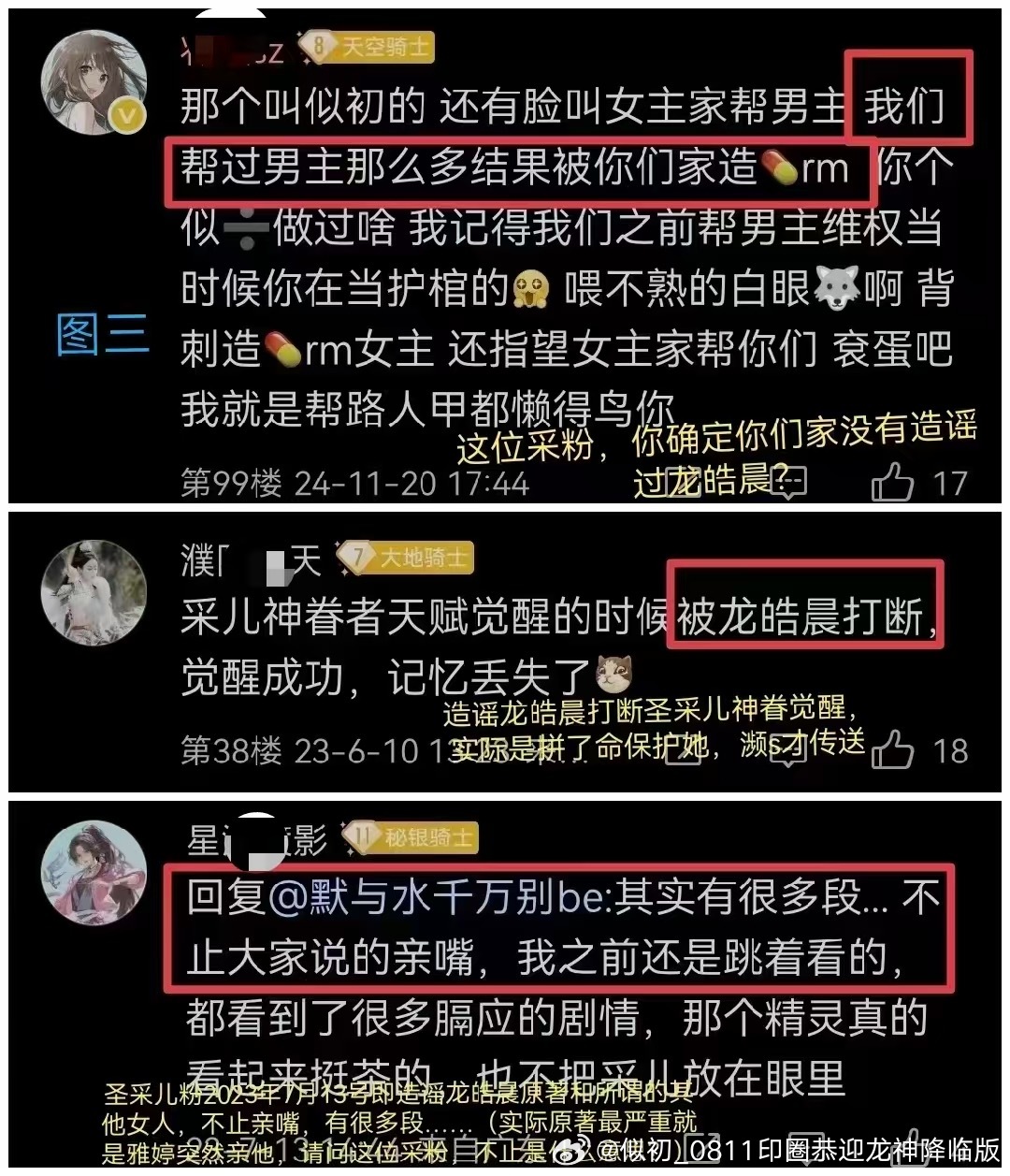 综上所述,龙圈和采圈的争吵以及最终的断交这一套事情的来龙去脉,是由于CP粉(其中有采粉)和采粉双b而不自知,早在2023年就各种带、rm、zy、拉cai龙皓晨,引起龙粉忍无可忍,回🐴反击,然后采粉倒打一耙,说龙粉不能独立行走、恶毒、zy、rm圣采儿,导致最终断交并吵成如今的样子,试问2023年你们对龙皓晨的那些话说了多久,在多少个平台,反反复复说了多少,你们自己心里有数,图上展示的只是冰山一角,如果这些话放到你钕身上呢?恐怕你们分分钟都接受不了,龙皓晨一个纸片人,被制作组操控,毁去原著丰富立体完美的人设,不是他shan了圣采儿的戏份,男主姐能忍到2024年才陆续反🐴乃至爆发,对你方已经是仁至义尽,不存在你方对我方问心无愧,圣采儿所遭受的一切,是你们粉丝这种双b、e心行为惹怒男主粉导致的,那就受着吧……