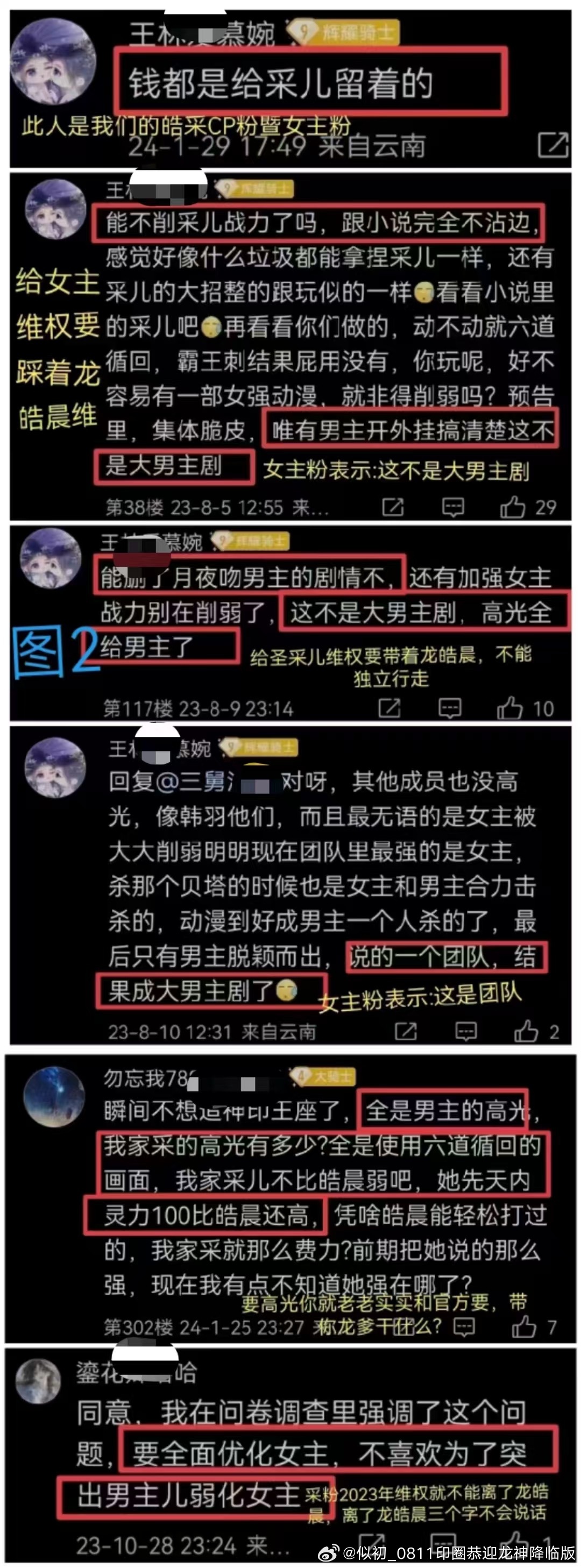 1、2024年男女主粉吵架升级并断交前后,圣采儿粉表示:你们男主粉维权不会独立行走,带我钕干什么?然而事实是,圣采儿粉早已在2023年给自推维权就三句话必带龙皓晨,龙皓晨粉一忍再忍,都没有很早爆发,如图1、图2。
