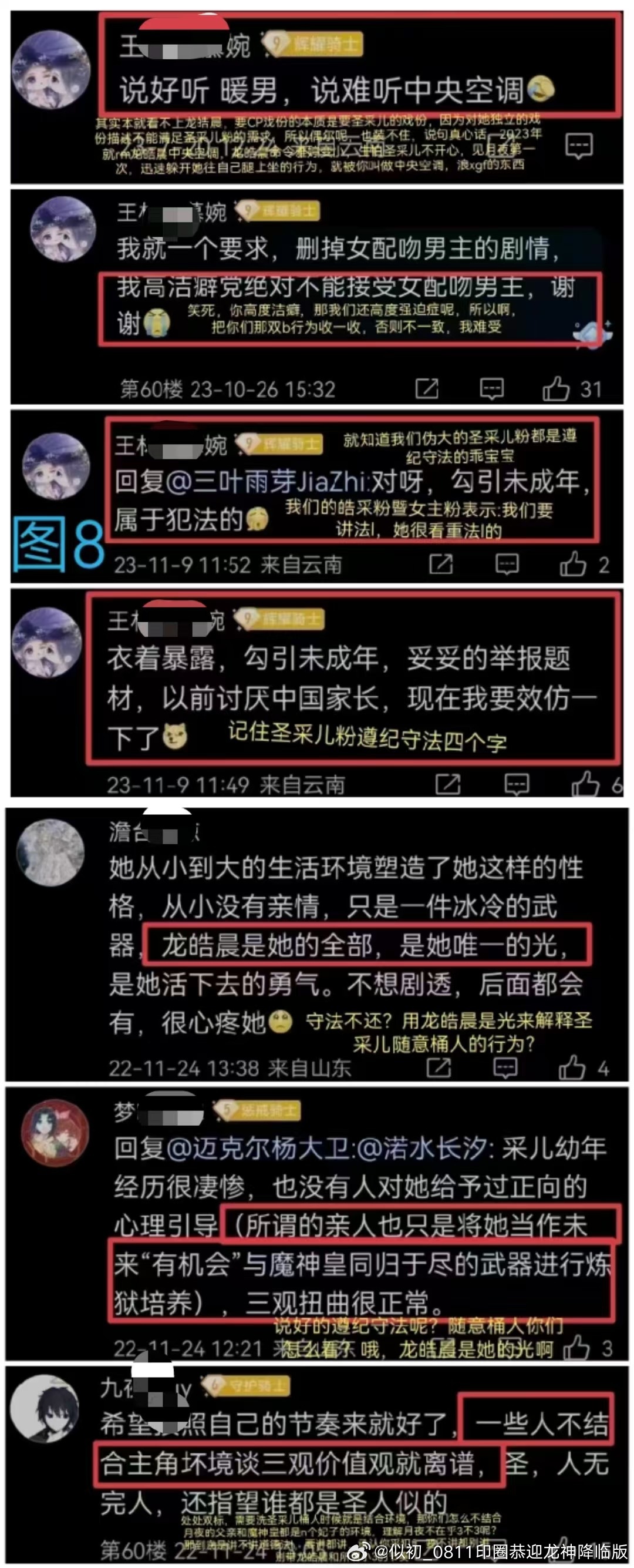 9、早都说了,就知道我们伪大的CP粉兼女主粉都是遵jsf的乖宝宝,如某CP粉暨圣采儿粉表示要守fa,然而圣采儿粉对自己采宝随意🪣人的行为百般维护,拿龙皓晨是光来洗,却对龙皓晨的所谓擦边行为疯狂带jz,如图8、图9,这位采粉,请问你怎么看你采随意🪣人此等违flj行为?