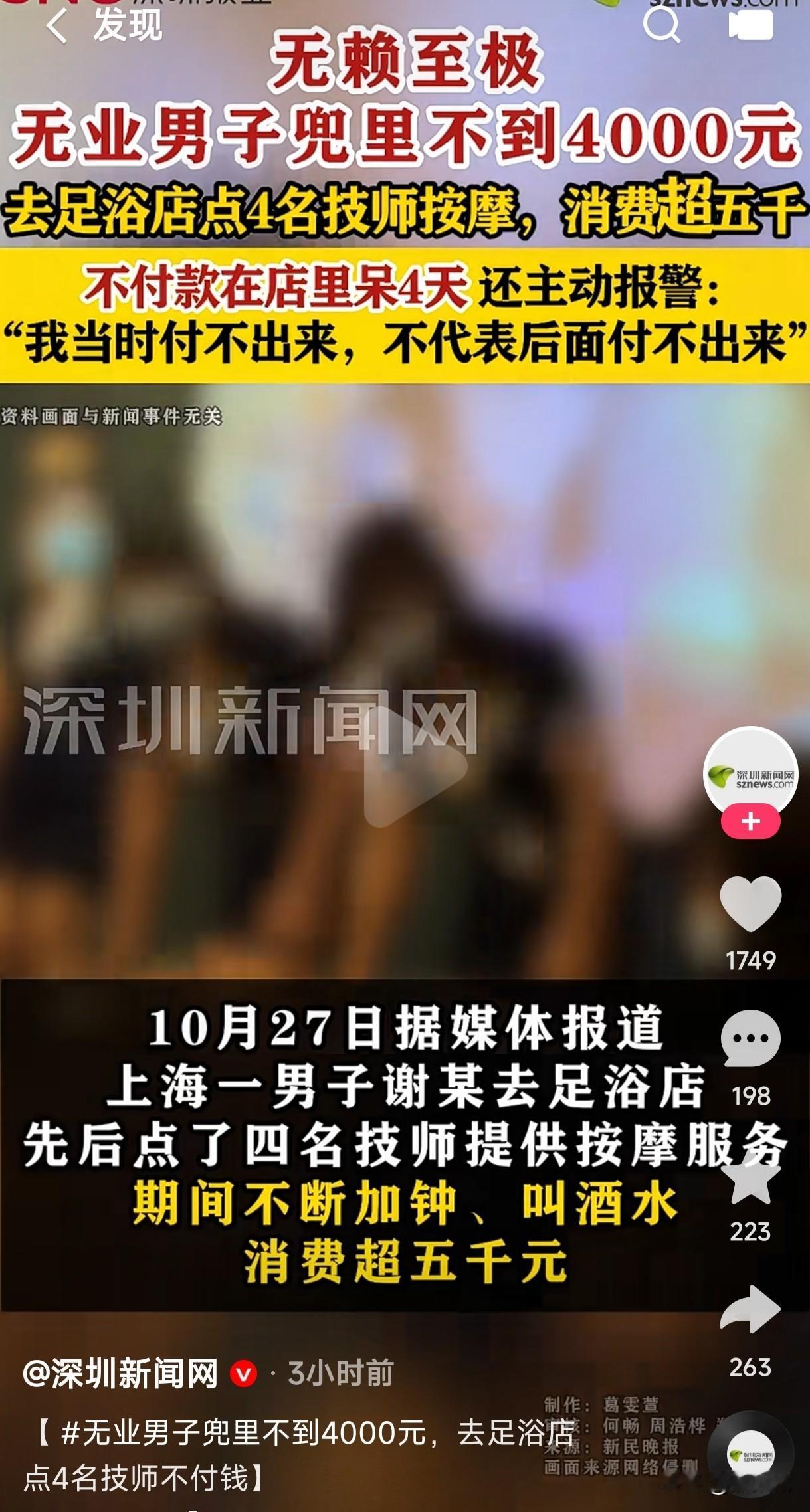 真是笑不活了,还有人去足浴店吃霸王餐的 上海一男子足浴店点4名技师按摩,消费超过5千,没钱付款在店里呆4天,最后还主动报警。 这种无赖还真是凭本事消费,谁都拿他没有办法,兜里装着不到四千块钱,去足浴店竟然一次性点了4名技师按摩,他这是四条胳膊腿一人按摩一个吗? 然而令人没想到的是,按摩完事后他居然没钱付款,兜里装着四千多消费超过了五千,没钱付款还理直气壮的说,他只是没钱,又不是不给钱,现在付不出来,并不代表以后也不付,店家对于这种无赖也束手无策,他居然在店里呆了四天,最后自己主动报警了。 经过蜀黍的调查,这男子原来是个惯犯,他用这种无赖的方式骗取消费超过2万多,都是在足浴店干的这种不要脸的操作,最后喜提二年特殊教育时间,真是既惊喜又意外,没钱非要装大款,最后把自己玩进去了吧。