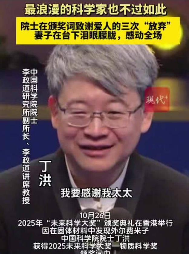科学家领奖现场,一句话让全场瞬间安静! 不是突破性科研成果的解读,不是获奖后的豪言壮语,而是中国科学院院士丁洪对妻子的三次致谢。 才华横溢的妻子,成全才华横溢的丈夫,背后是她非凡的爱的付出!这既是妻子的爱,又是看准了夫君的潜力股特质,所以妻子放弃学业和高薪,全力以赴支持夫君,妻子的博大之爱值得感谢! 对丈夫事业的支持,就是对祖国科技事业的支持,家庭的支持,应该是科学家最后一堵坚不可摧的防御了吧。看来,任何男人的成功,都需要有一个善解人意的妻子! 这个科学家得到最高荣誉时,都念念不忘自己的妻子内贤助,是一个高尚的人,不是那种在春风满面时忘了妻子的渣男人,有这种品德的人,才是人们要尊重的人。