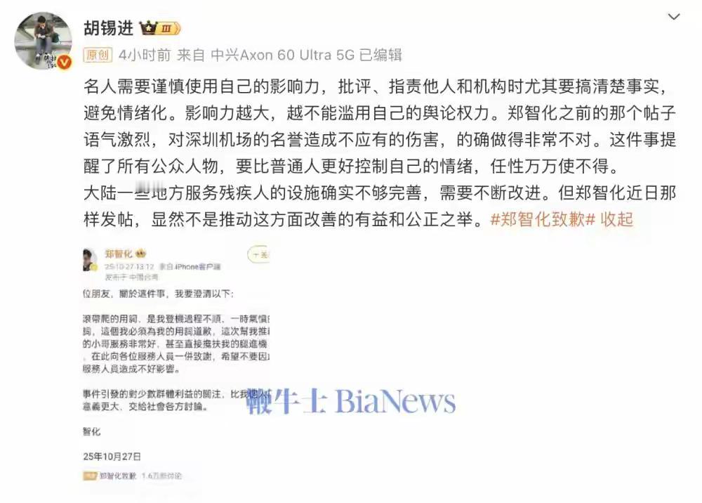 郑智化的深圳机场连滚带爬登机吐槽,让他在网友心目中的人设彻底翻车了,连胡锡进都说公众人物就该守规矩,说错话、带坏了风气,影响好多人,机场员工一夜之间被骂到怀疑人生。 公众人物,本就以为自己高高在上,要有特殊待遇。殊不知这是令网友最反感之处。 郑智化虽说连续道歉了三天,可网友依然对他不买账。因为公众人物,与普通人不应该,也不可能有什么不同之处,该遵守的规则还是要遵守。