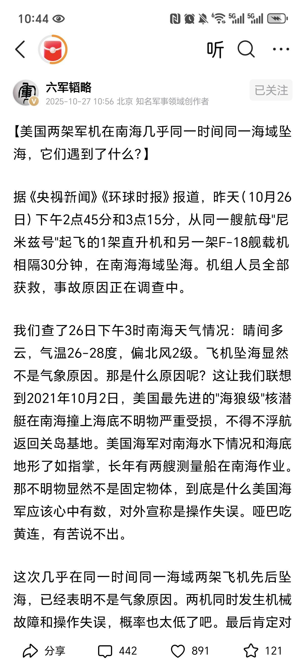 不知道为啥看到这种新闻内心有种说不出的开心来… 不知道各位看官是否也与我同一个心情? 谁不知道南海是咱中国人的海域,自古以来就是。 但各路老毛子动不动就来咱家门口耀武扬威,蹬鼻子上脸的。 活该鹰酱飞机掉海里了,最好来一架掉一架,海龙王着急下班呢! 不管它是从米尼兹号还是什么号上飞来的,海龙王可不管你的啥毛子,该收就收,以后还来就继续收。 颓势下逞强的美国人犹如西边快要落山的夕阳,249年光阴过去,就是250的到来。在咱中国人眼里,250代表啥?大伙不会不晓得吧?!