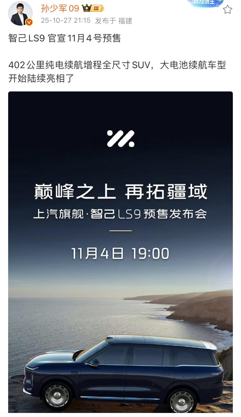 孙少军:智己LS9 官宣11月4号预售 ! 402公里纯电续航增程全尺寸SUV,大电池续航车型开始陆续亮相了,明年开始这种搭载大电池大油箱的车辆将会成为主流产品。 消费者的需求实际上一直是非常简单的,消费者要的就是车辆没有续航焦虑,比如说电车只剩下几十公里续航了那时肯定要充电,如果有油箱就不同了,可以随时出发。 各位是怎么看的?欢迎评论区留言。