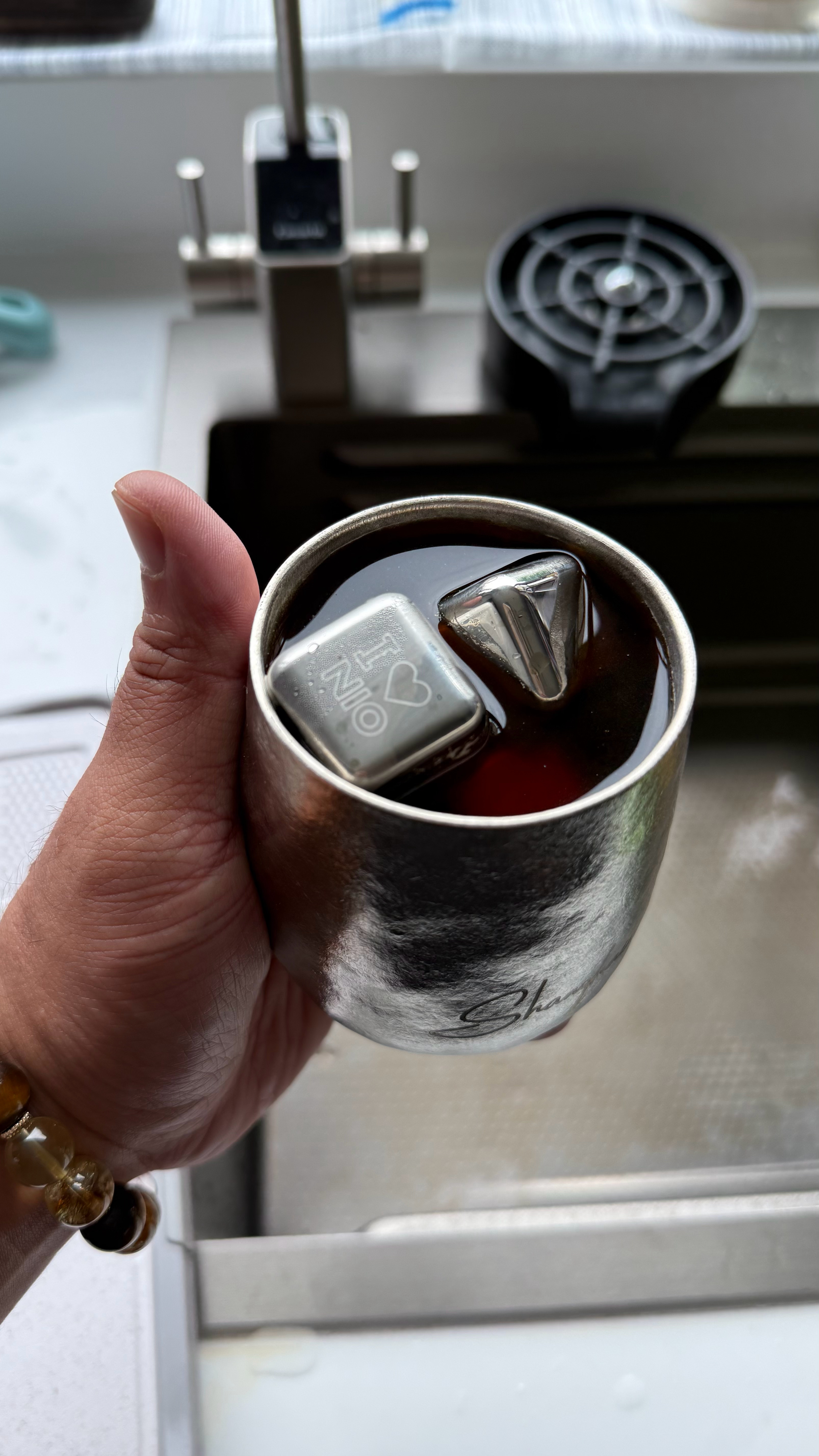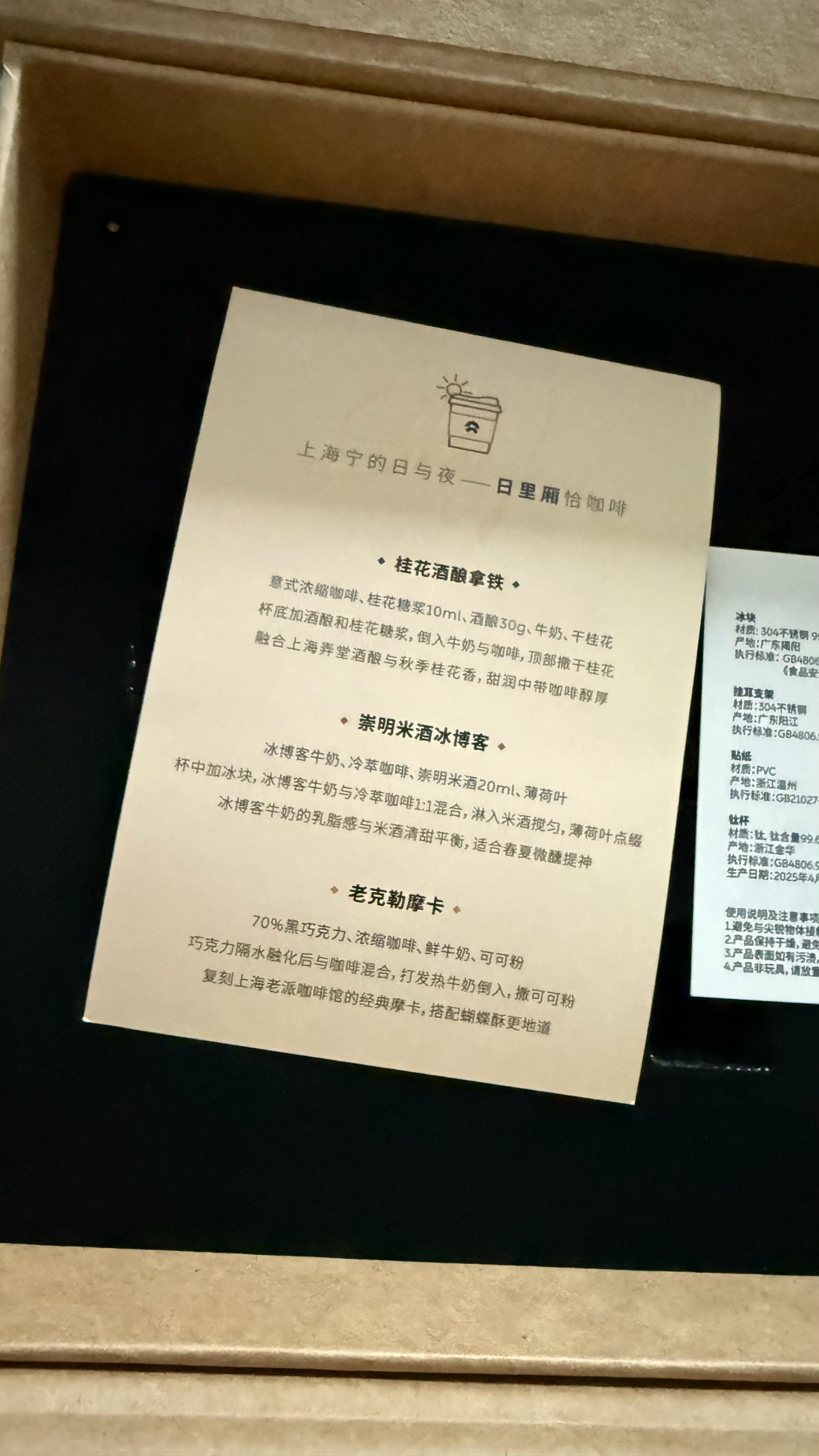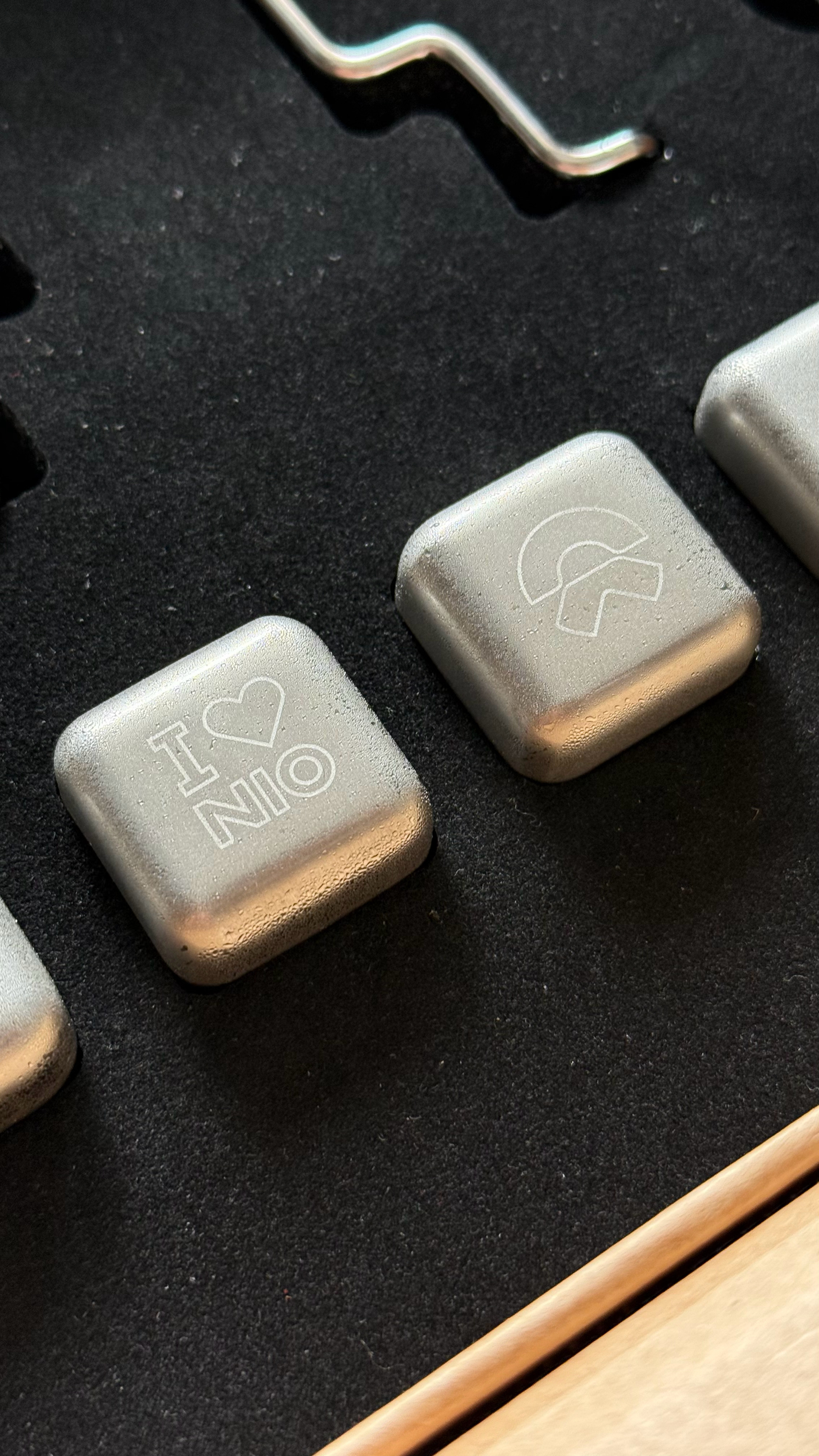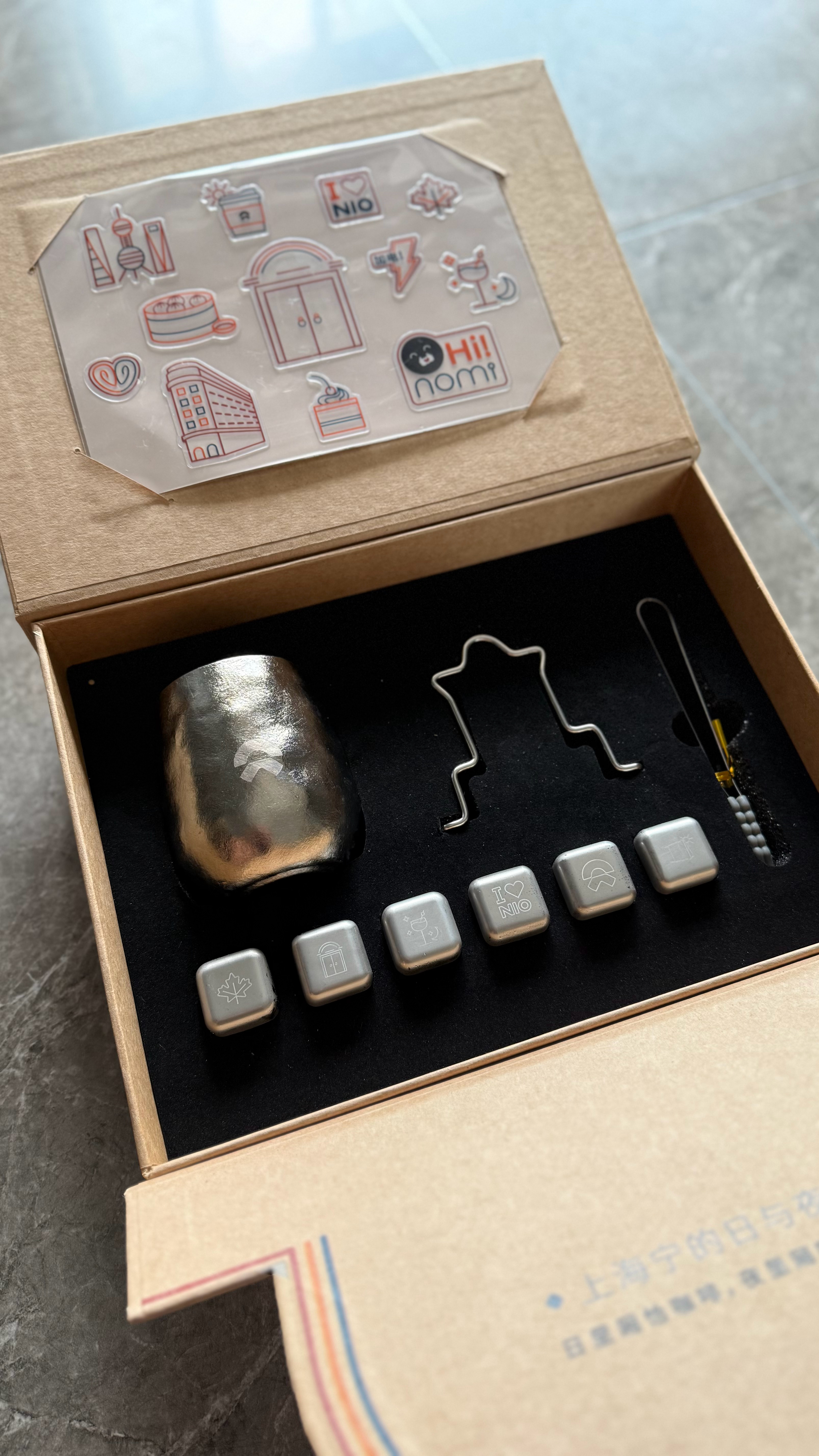 托我的fl从上海牛屋买了一套钛金属的咖啡杯,用积分才200多块,上面有蔚来logo和shanghai的蚀刻,质感相当的好。主要是这个金属冰块完美解决了我喜欢喝双份冰浓缩的怪癖。它还有滴漏咖啡架、镊子,蔚来就是连这种周边都要做的很精致,爱💖。