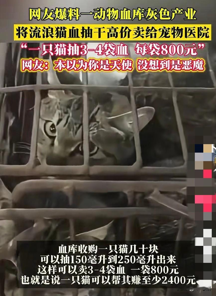 一则消息震惊了很多人的心,流浪猫狗居然是动物血库的贡献者。 近日有网友爆出,广东某些宠物医院,需要的动物血库居然是被一些人,搜集流浪猫狗,或者花几十块低价收购而来。 这些人从一只猫身上,抽取200毫升左右的血,再以几百块的高价卖出去,被抽掉血的猫咪就不管了。还对猫主人谎称,血浆是正常渠道而来,谁家猫狗会主动献血吗? 用流浪猫狗的血去救宠物猫狗,这些动物医院真的是救死扶伤吗?还有很多打着收养流浪猫狗,一边是互联网上博取流量和同情换来捐款打赏,背地里却一样拿着这些小生命做着龌龊的勾当,实在可恨啊。 一想到流浪猫狗靠着求生的毅力换来整个冬天的生命,却被不法分子更多的伤害,希望它们能有真正的容身之所,不爱也请不要伤害啊。 (图片来自网络视频)