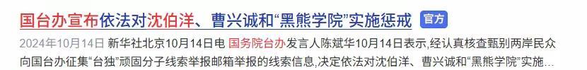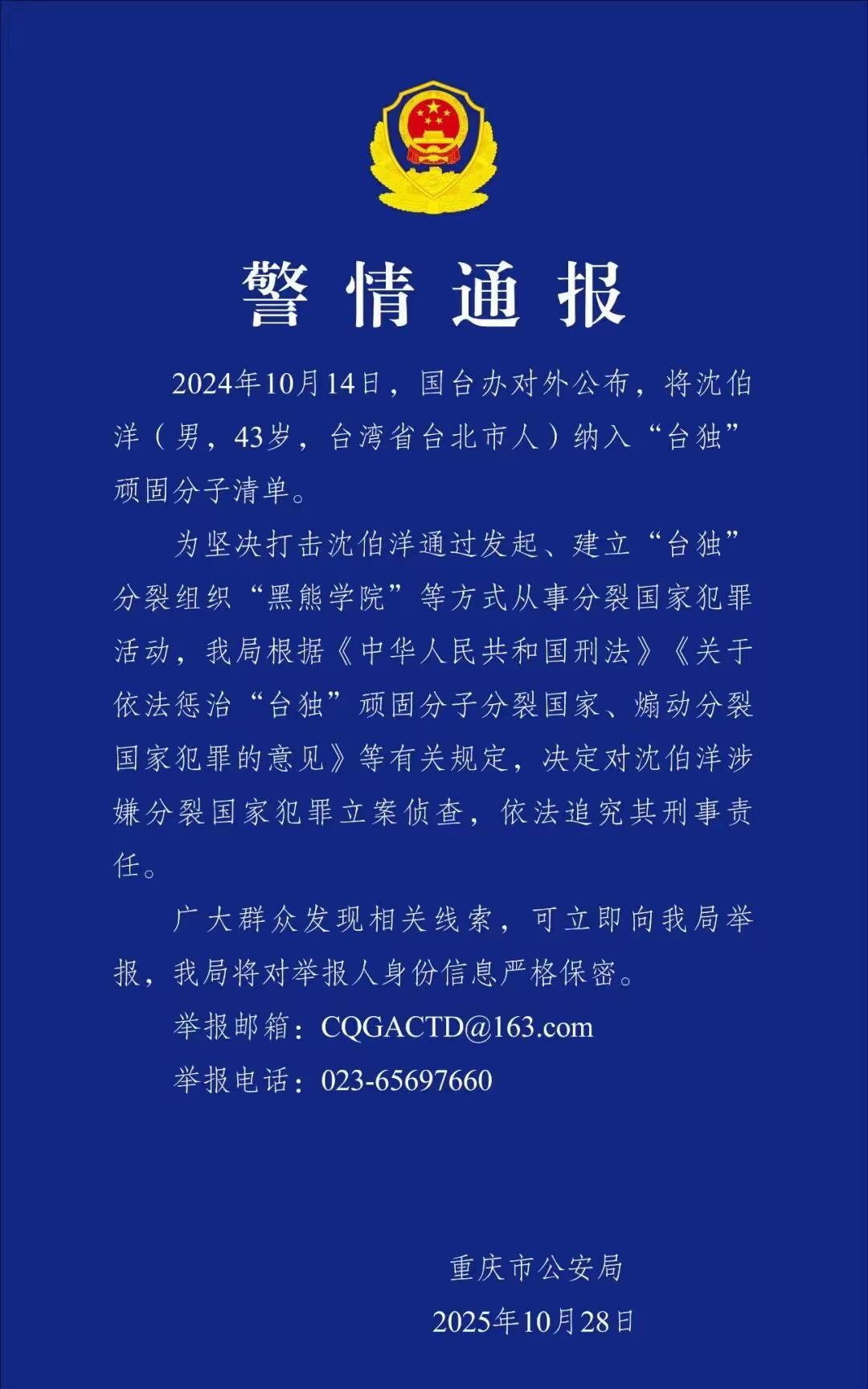 别看你今天闹得欢,小心日后拉清单。清单如期而至:重庆市公安机关决定立案侦查“台独”顽固分子沈伯洋,依法追究其刑事责任。 沈伯洋,男,43岁,台湾省台北市人,已被国台办纳入台独顽固分子清单。他通过发起、建立“台独”分裂组织“黑熊学院”等方式,从事分裂国家犯罪活动。 其父沈土城的公司通过和大陆某些企业合作,谋取利益。挣着大陆的钱,却搞着分裂国家的事,这是典型的“吃饭砸锅”行为。 今天,国家重拳出击,要对“台独”顽固分子沈伯洋立案侦查,依法追究其分裂国家的刑事责任了。 激动的心,颤抖的手。释放的信号,令人抖擞。这都已拉清单了,肯定就是回归的前奏啊。你品,你细品……