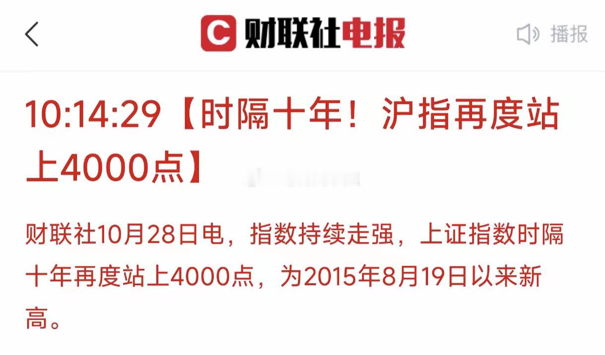 就在刚刚,a股突破4000点大关,再次年内新高!同时也是站上了具有象征意义的4000点,上一次还是10年之前,可以说人生有多少个10年可以见证。但是大盘今天似乎不给力,晚一秒这个历史突破都发不出来。可能很多人会担心接下来的市场走势,下午会不会大跳水。老实说这要看这个新闻发酵程度,今天a股4000点是肯定会上热搜的,就看能不能吸引来一波新的增量资金。