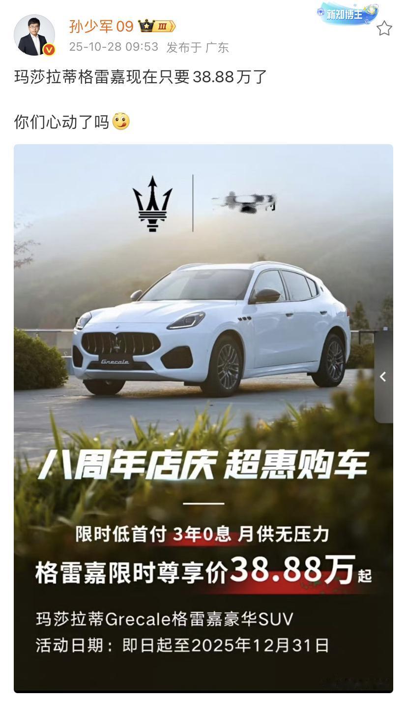 孙少军:现在的玛莎拉蒂只需要388,000了,大家赶快购买! 也不知道为什么现在的人好像对于玛莎拉蒂这个品牌没有那么喜爱,以前真的是妥妥的超级豪华车的代表。 现在在看玛莎拉蒂,似乎他们有点跟不上时代,落后的外观,落后的内饰。除了机械性能之外,其他真的没有太多的东西。
