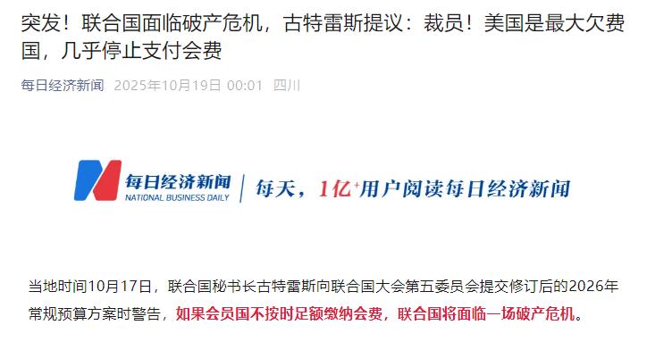 联合国又来要钱了,这次要钱要的很绝,很干脆,秘书长古特雷斯直接放狠话,不交钱就裁2681人,2026年预算砍15%,连“破产”俩字都抛出来了,看着是急到火烧眉毛,可明眼人都知道,这出戏的病根全在美国身上。 本来规矩是这样的,联合国193个成员国,得按各自的经济实力交会费,比如看GDP、人均收入这些实在的指标,这样联合国才能正常干活。可到2025年9月底一看,今年的会费才收上来66.2%,比去年同一时候少了快12个百分点,超过三成的国家都没交够。 就说去年年底吧,欠的钱就有7.6亿美元,到现在都没结清呢。可这些零散的欠款加起来,跟美国欠的比,那真是小巫见大巫。 要说交会费,美国本来该出最多,常规预算它得扛22%,维和经费更得掏超过25%,说白了就是联合国里的“大股东”。可这“大股东”偏偏爱当“老赖”,到现在欠的会费都超30亿美元了。 这里面光是2025年该交的常规预算,就欠了8.2亿多,剩下的全是以前没清的旧账,还有该给的维和经费也没给。更过分的是,自从特朗普今年1月又当总统,美国几乎就没往联合国账户里打过一分钱,连2024年欠的钱都拖着不给。 你可知道,联合国里140多个国家,都老老实实交够了2025年的常规预算,真正拖后腿的就那么几个,可美国一个国家欠的钱就占了大头。这30多亿美元可不是小数啊!要知道联合国2025年的常规预算总共才37.2亿美元,美国一家欠的钱,快赶上全年预算的八成了。这么大的窟窿,就算其他国家想帮忙填,也填不上啊。 所以古特雷斯说“破产”,真不是吓唬人。美国欠的钱已经让联合国没钱周转了,之前就有几十个人道主义项目,因为没钱突然停了,联合国的官员都警告过,这事儿搞不好会闹出人命。 现在被逼得要裁员、砍预算,最后倒霉的还是那些在一线干活的人,还有那些等着援助的地区。可美国压根不当回事,甚至在自己下一年的预算里,直接把联合国维和这些项目的经费给取消了,要么就大砍特砍,明摆着就是不想出钱。 说到底,联合国这钱的危机,就是美国凭着霸权耍任性闹出来的。它在联合国里话语权最大,却不想尽该尽的义务,反而拿拖欠会费当筹码来施压。这种只想着享受权利、不想承担责任的做法,才是真的要毁了多边主义的根基啊。