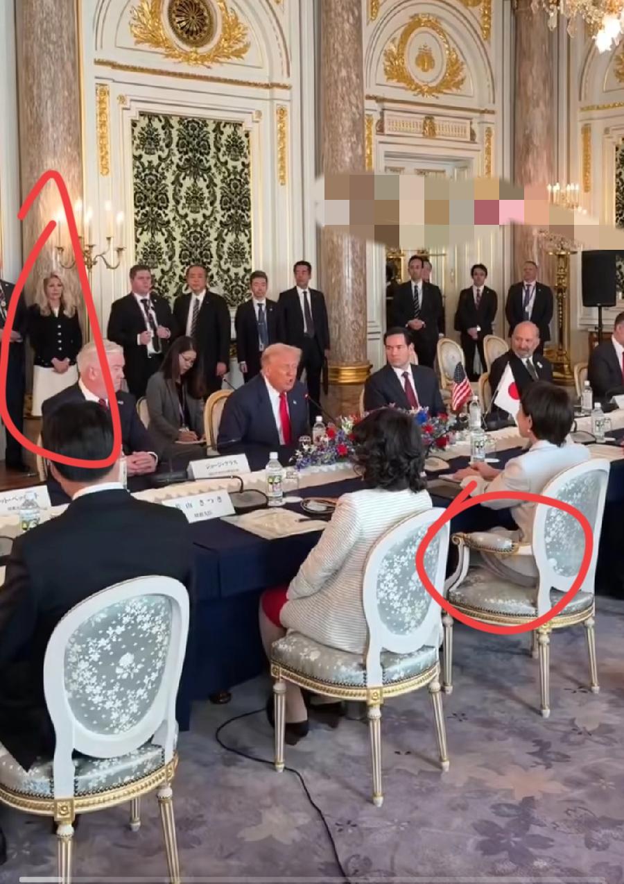 高市早苗与特朗普会谈,现场3个细节: 1、在赤坂离宫,日本国宾馆,纯西洋风格,还以为美国主场! 2、座椅有区别,只有中心两位主宾有扶手,等级有区分! 3、全场最亮眼的人,白宫礼宾司女司长莫妮卡!风韵犹存太性感!
