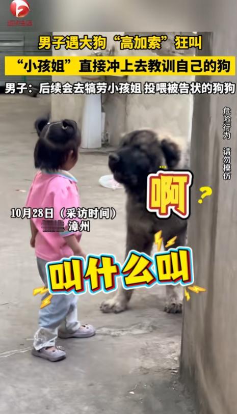 “笑不活了!”10月28日,福建漳州,一男子到一家厂里办事,结果找厕所时一条凶悍的大狗窜出来对着他狂叫,厂长女儿闻声赶来,男子连忙向她告状,只见还没狗高的小女孩上去给自家的大狗一顿“胖揍”,网友:二当家的威武! 一男子到一家厂里办事,到后面找厕所时,墙角突然窜出一条凶悍的大狗,对着男子就大声狂叫,还作势要扑过来,男子吓得不轻,怕大狗咬到自己,不敢继续在往前走。 厂长的女儿听到狗叫声赶来过来,男子立马向她“告状”,小女孩听后二话不说就冲到大狗面前举起拳头,没想到凶悍大狗看到小主人过来就变了一副嘴脸,瞬间怂了。 还没有狗高的小女孩给大狗一顿胖揍,一边揍一边教育狗狗不要对着客人叫,这让一旁的男子佩服的五体投地,直呼“小孩姐”。 这条大狗是厂长养的高加索牧羊犬,才六个月大,不咬人,但看到陌生人可能有些激动,男子表示后面他会去犒劳“小孩姐”,也会去投喂被揍的大狗,争取和它搞好关系。 不少网友调侃小女孩是二当家的,揍大狗的模样也太威武了,不得不说,即使体型再大、长相再凶的狗狗,遇见自己的小主人也得低下头来,变得老老实实。 信息来源:《男子遇大狗“高加索”狂叫,“小孩姐”直接冲上去教育自己的狗》AHTV第一时间