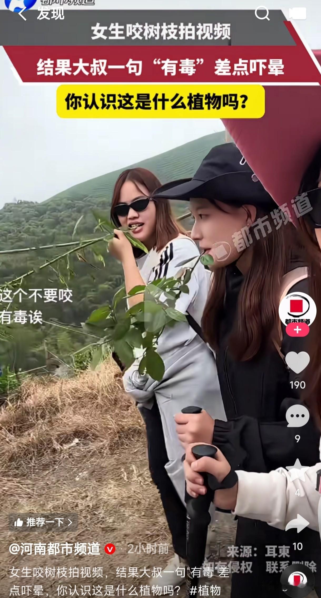 女子三人爬山嘴咬树枝一边走一边拍视频,突然被路过的大叔一句有毒,顿时三人差点被吓晕。 不认识的植物是不能随便往嘴里咬的,看起来不起眼的一颗小树枝,有可能身藏剧毒,只要破了皮它的毒随时都能爆发出来,像这种不认识植物耍酷的人,这万一中毒了可能还找不出来原因,话说我们乡巴佬进城两眼一抹黑,这是事实,但你们城里人进山也是一无所知,随便往嘴里咬植物,这不是拿手榴弹擦屁股找死吗?