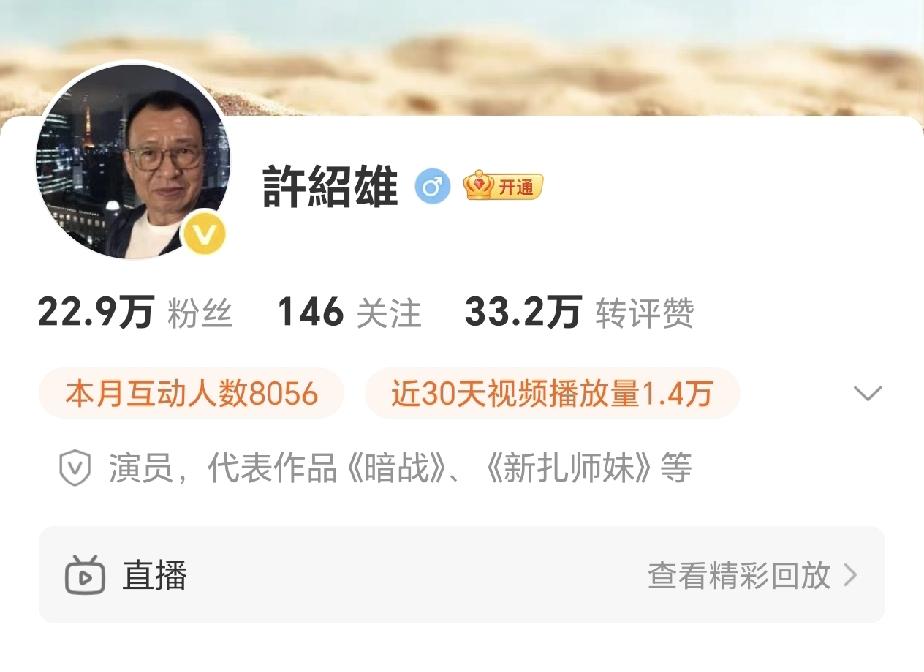 许绍雄的个人账号, 留给他的粉丝不多,只有22.9万。 但是他过世后全网哀悼,实际上的观众粉和路人粉数以亿计。 细心的粉丝发现,半个月前他还在为自己的电视剧做宣传,可以说矜矜业业,一辈子扑在了自己的演艺事业上,如果再长寿十年就好了,唉!
