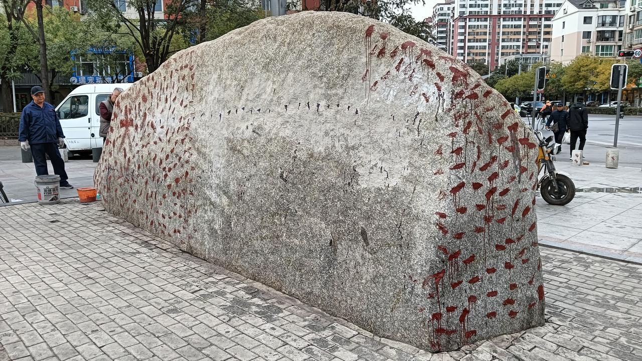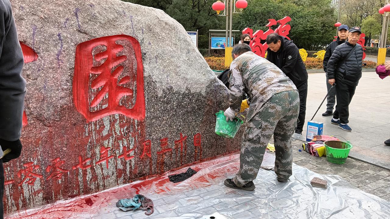 鞍山永乐公园石碑遭涂鸦 工作人员紧急清理 今日,鞍山市永乐公园入口处标志性石碑被发现大面积涂鸦。从现场图片可见,原本庄重的"永乐公园"四个大字及石碑表面被红色涂料覆盖,形成密集斑点状涂鸦,严重影响公园形象。 事发后,相关部门迅速响应,已有工作人员身着工作服抵达现场进行清理维护。目前清理工作正在进行中,公园管理方表示将尽快恢复石碑原貌,并加强园区夜间巡查力度。 此次涂鸦事件发生在城市重要公共空间,引发市民对公共设施保护的关注。有关部门呼吁市民共同爱护公共环境,维护城市文明形象。