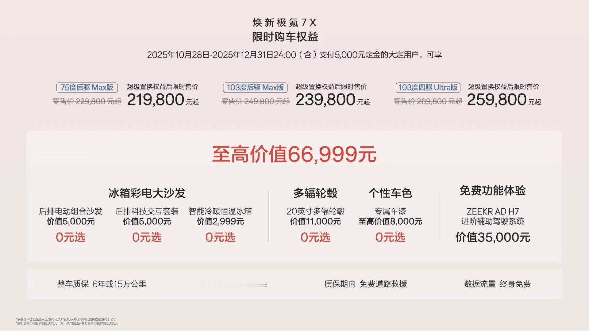 焕新极氪7X正式登场,限时价格21.98万起,要做20万级纯电SUV卷王。全系搭