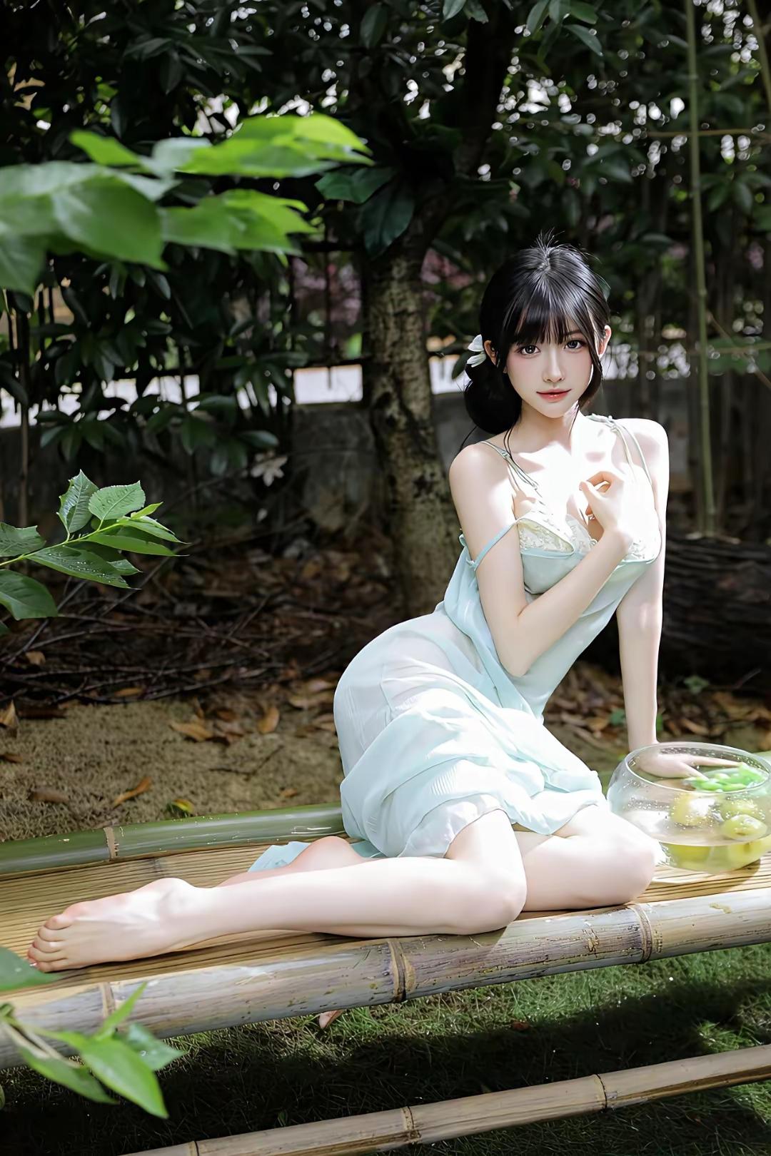夏日竹林中的清新少女,裙摆轻扬,绿意盎然。