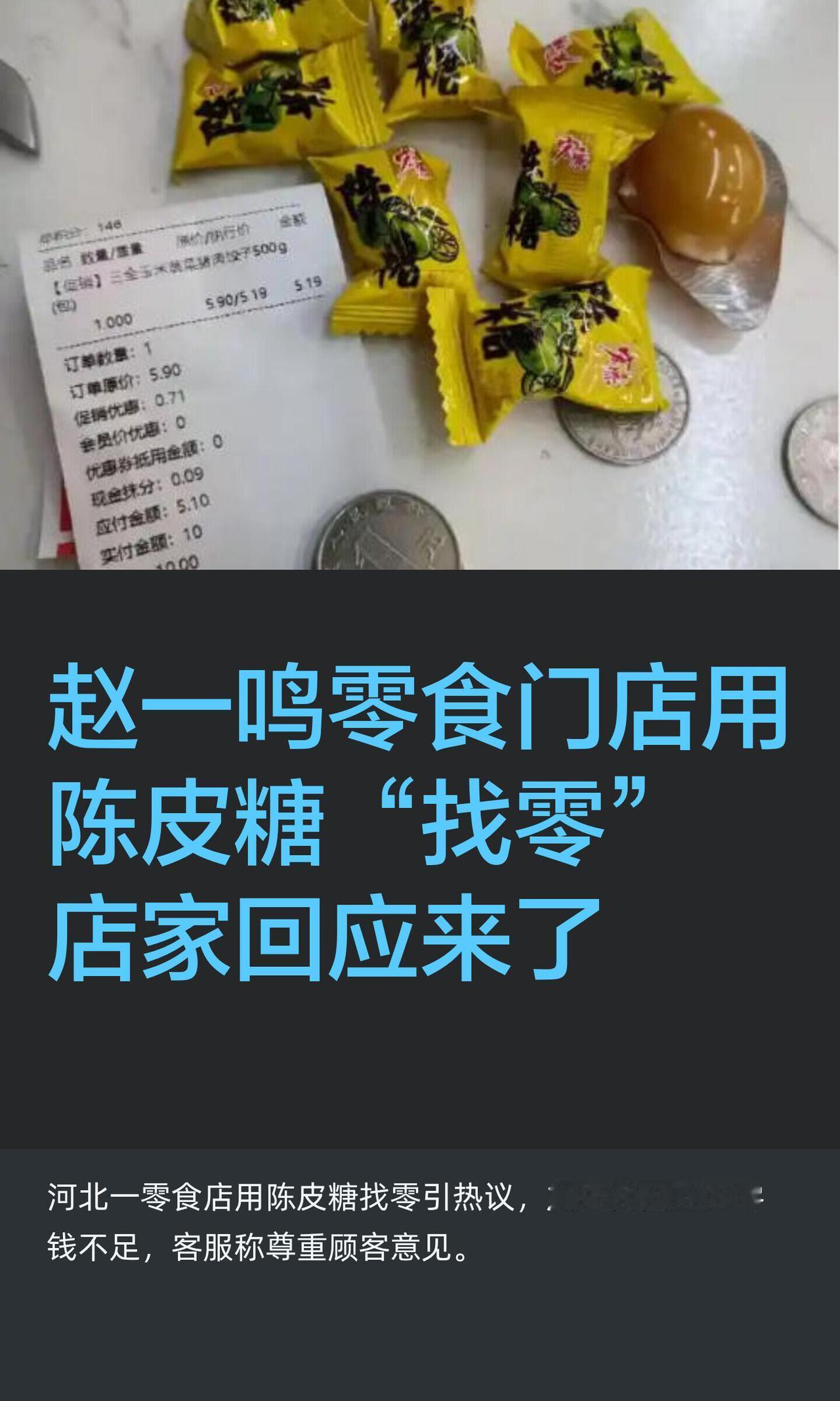 这事儿确实挺让人无语的。在河北沧州一家赵一鸣零食店,有顾客付了10块钱现金,买了个5块1的东西,结果该找的4块9毛钱,愣是被店员用4个硬币、7颗糖外加一个鹌鹑蛋给打发了。算下来,一颗成本才几分钱的陈皮糖,在店里硬是抵了一毛钱用,这不明显是店家在变相占便宜么。 店家那边的解释是,现在一毛钱的零钱太难换了,所以才用糖代替,还强调给的东西“价值不低于一毛”。可问题是,你觉得值一毛,问过顾客愿不愿意了吗?人家要的是钱,不是你这几分钱的糖。好在他们总部客服还算明白,直接说了不能强制用糖找零,得听顾客的,不然会被要求整改。 要我说,这种“糖找零”的操作本质上就是耍小聪明。你开店做生意,备足零钱是基本准备,不能把麻烦转嫁给顾客。几分钱的糖硬充一毛钱,不仅让人心里膈应,严格来说还侵犯了消费者的权益——咱有权决定要不要你的糖,而不是被迫接受。 估计不少人都遇到过类似情况,尤其是小超市、便利店,用颗糖、打个条代替零钱好像成了潜规则。下次再碰上,可以直接明确拒绝,该要多少钱就要多少钱。商家也长点心吧,找零是基本的诚信,别为这点小利把口碑砸了。