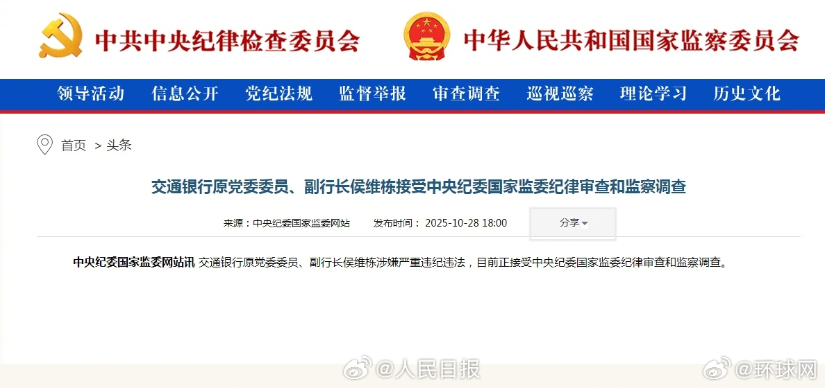 【#交通银行原副行长侯维栋接受调查#】交通银行原党委委员、副行长侯维栋涉嫌严重违纪违法,目前正接受中央纪委国家监委纪律审查和监察调查。(人民日报)
