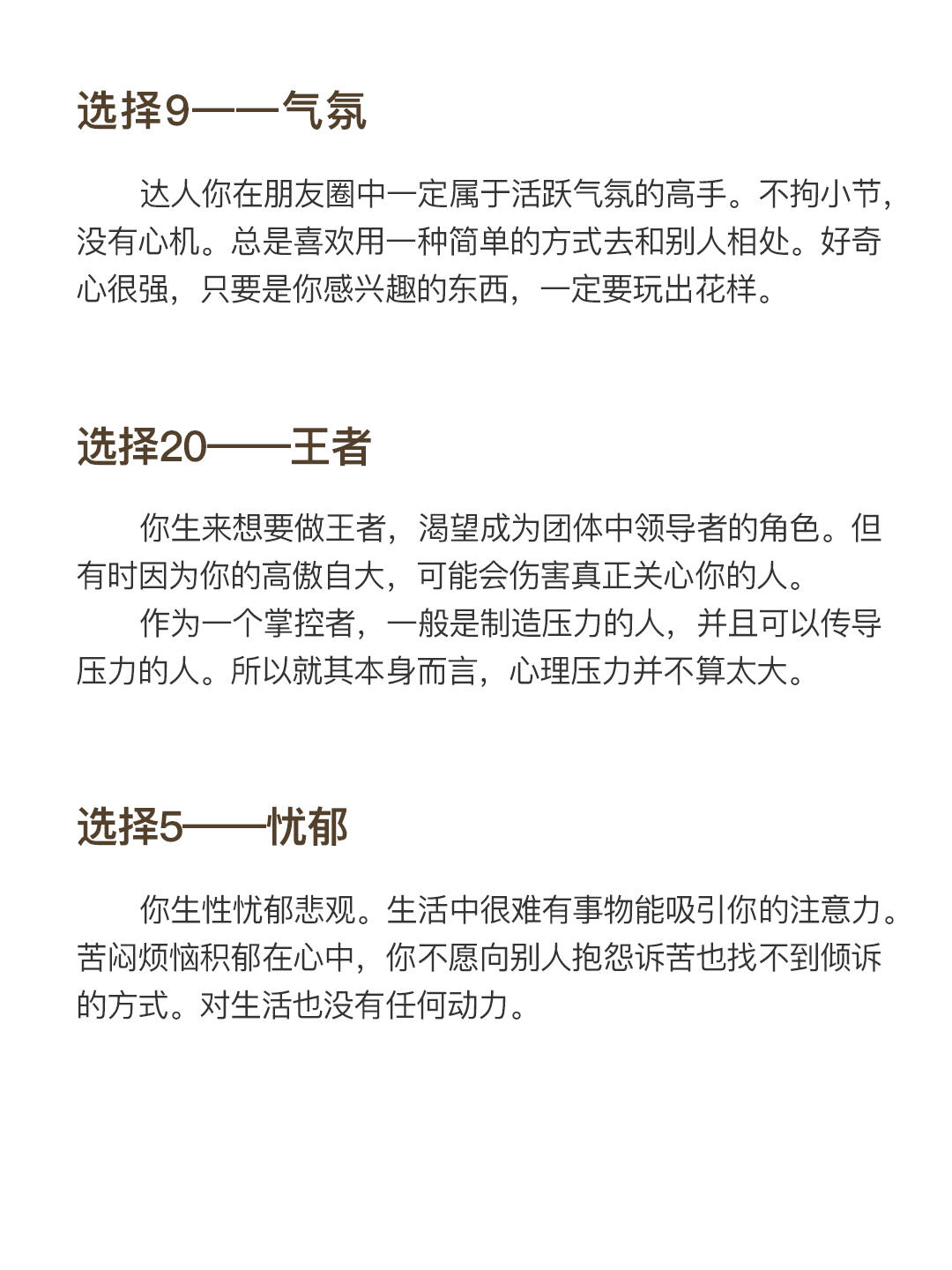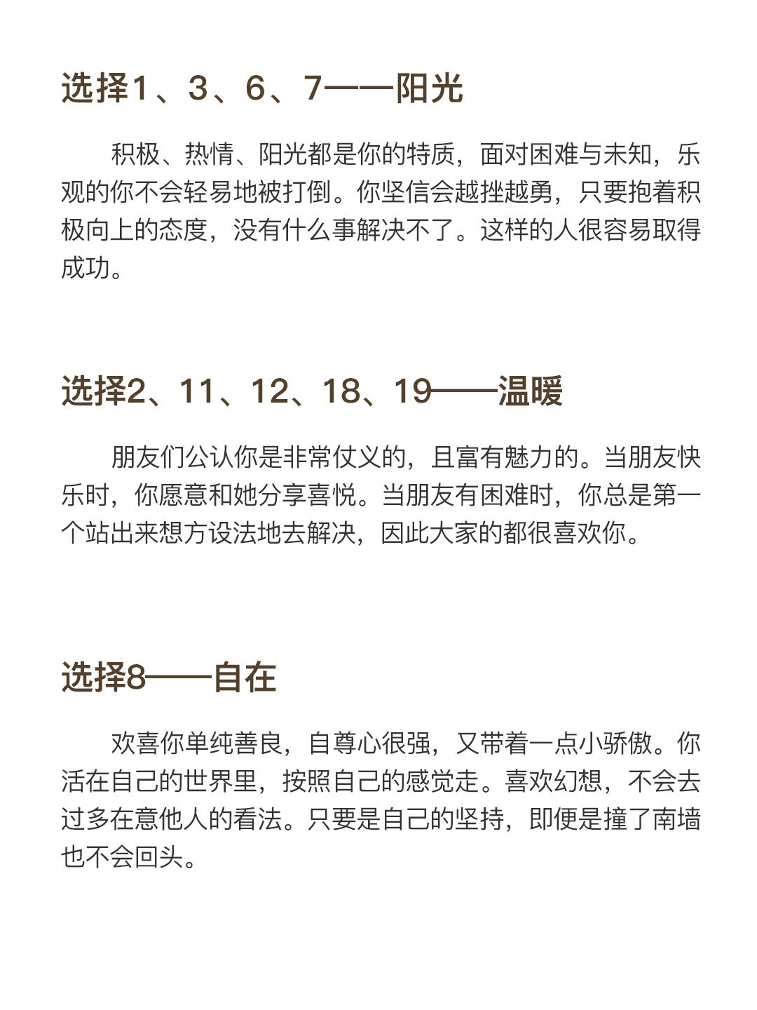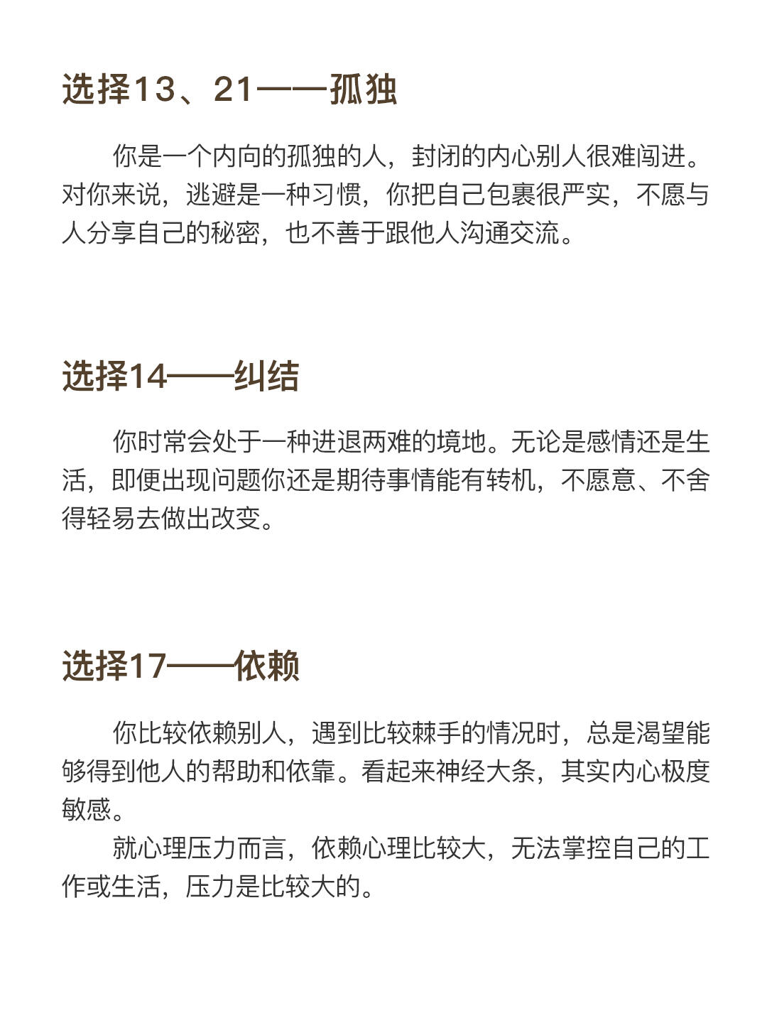 上图中有21个小黄人,请在很短的时间内,选择出最符合你当前状态的位置。 图案说明: 20号是站在树的高处并且居中的位置。 16号背着17号。 1号双手抓在树枝上。 19号试图去拉一把正在下坠的14号。 14号正在掉落,5号是已经坠落地上。 注:测试结果翻页查看