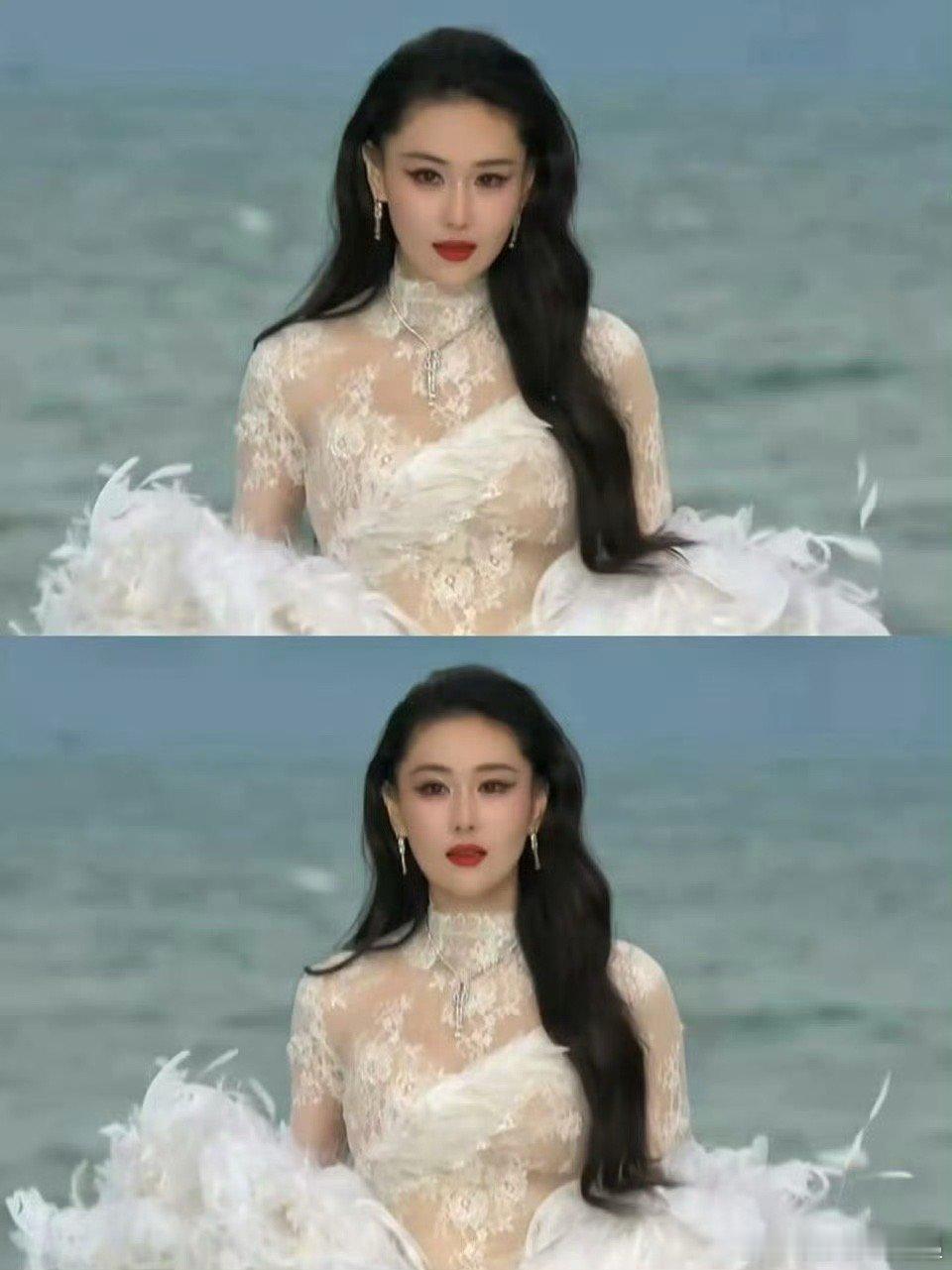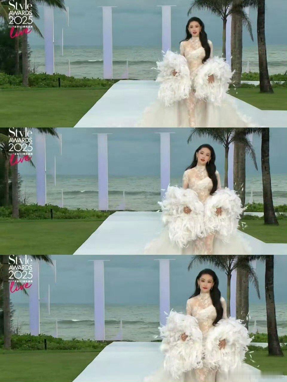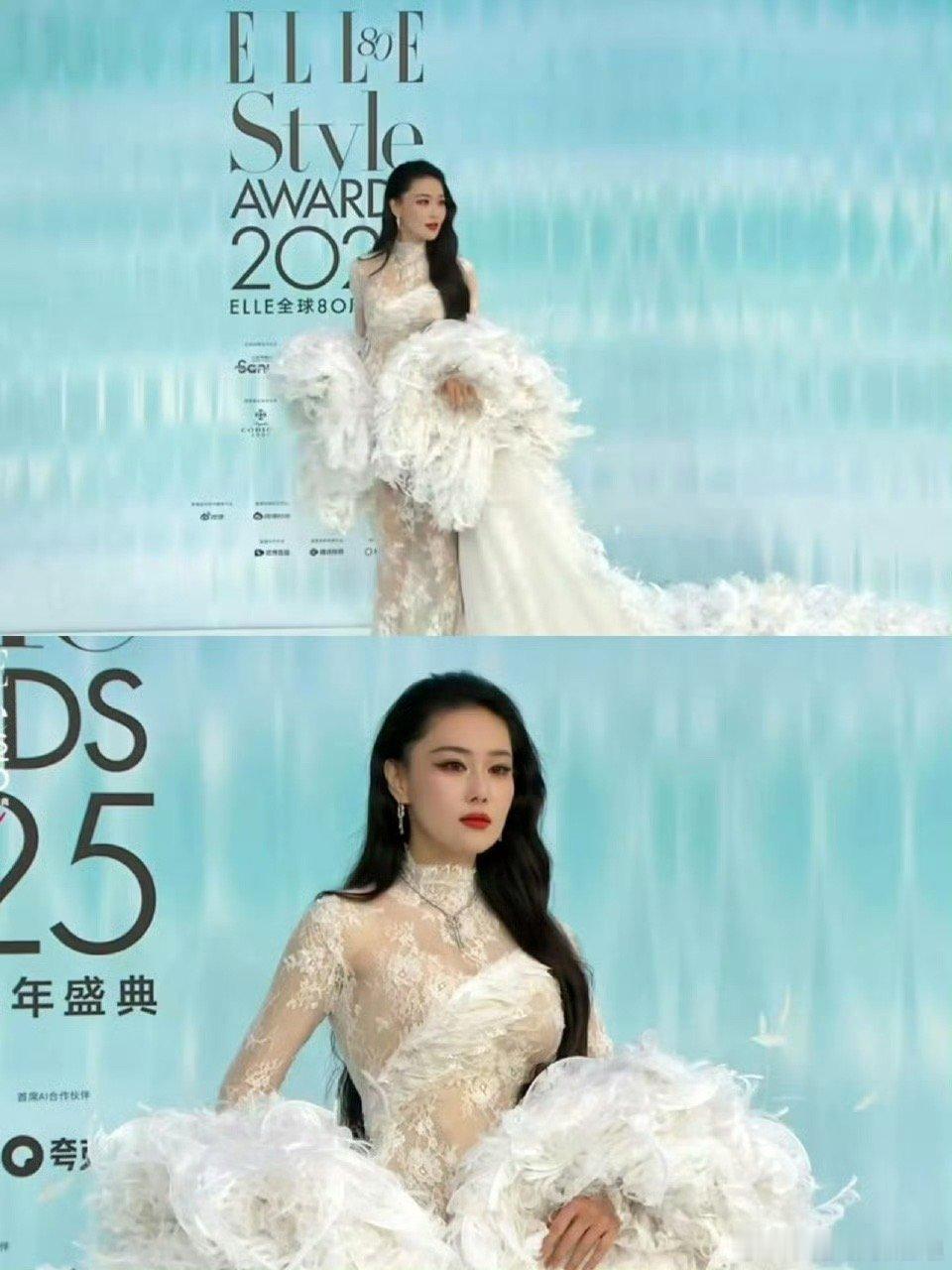 张馨予出场秒了 张馨予一走上红毯就自带光芒,半透视蕾丝连衣裙让她的曲线若隐若现,搭配长羽毛披肩,优雅中带着一丝野性,25斤的拖尾在她脚下如行云流水般自然,整个人美得让人移不开眼。