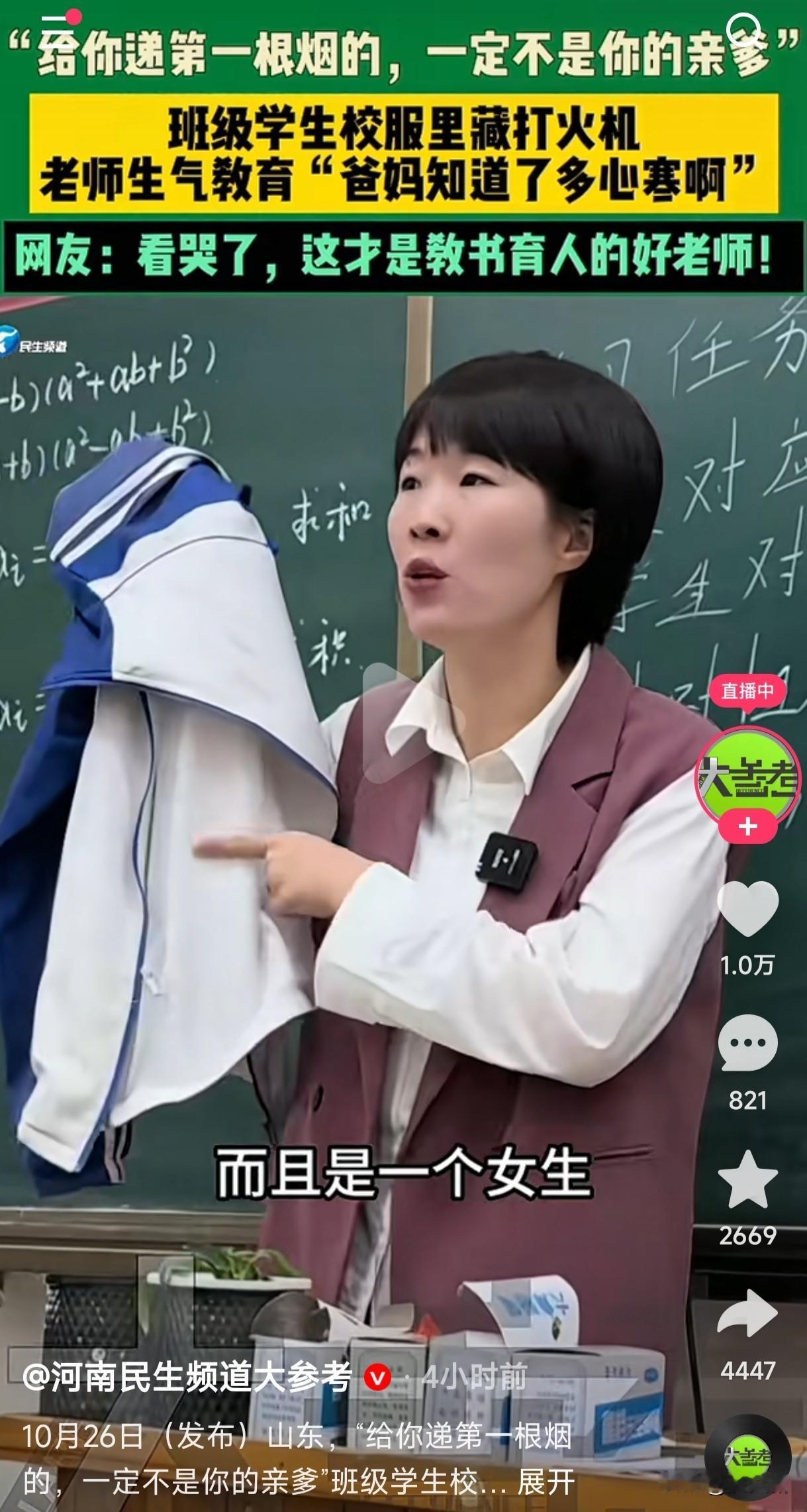 这老师小时候是不是卖东西专门称秤的,一件校服拿在手里就能感觉到口袋里面有东西,而且还是一个学习好的女生,口袋里面装着打火机。 如此敬职敬业的老师才是教书育人的好老师,她严厉的说道作为学生不好好学习,竟然偷偷抽烟,这要是让父母知道了该有多么的心寒,别人递给你的不是烟,而是想把你拉下深渊,断了你未来的前程,努力学习就是对父母最大的回报,也是对自己未来能有个好的出路。 这样的老师才是真正的好老师,如果我当初遇到这样的老师,那我现在不会混成这叼样。