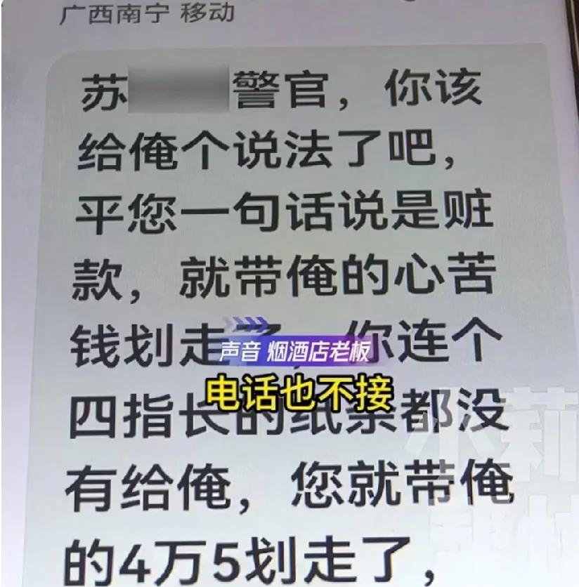 老板收4.5万转账后银行卡被冻结,原路退款反受损失 10月28日,河南洛阳。一家烟酒店老板拿着广西崇左民警留下的字条,满脸绝望地对着镜头哭诉,引发网友关注。 当天,三名男顾客走进烟酒店,开口就要一百一十条高档香烟,称用于中秋节送礼。老板夫妇没多想这笔生意有问题,按正常流程发货收款。对方很爽快,先付一万现金,剩余四万五扫码转账。五万五千元的生意顺利成交,老板满心欢喜。 几天后,老板的银行卡突然被冻结。银行告知这笔钱涉嫌诈骗,随后广西警方称这是涉诈资金,要求他退款,还到店里当面承诺“先退款,你的损失我们会处理”,并留下写有联系方式和单位的字条。 老板起初不同意,怕“钱退了烟要不回来”。但最终还是把钱转了回去。结果烟没了,钱也没了,再打电话却无人接听,无奈之下,老板只能向媒体求助。 该老板提出疑问却戳中要害:“骗子骗了人,我正经卖货,凭啥让我承担损失?” 其实,对于商户来说,只能看到转账记录,钱到了、账清了、货给了,哪想得到这钱竟然是赃款? 确实,商户配合办案是义务,但是警方保障商户权益也该是责任,不能只谈义务不谈责任。 民警的失联,透支的不仅是个人信誉,更是公众对执法部门的信任。