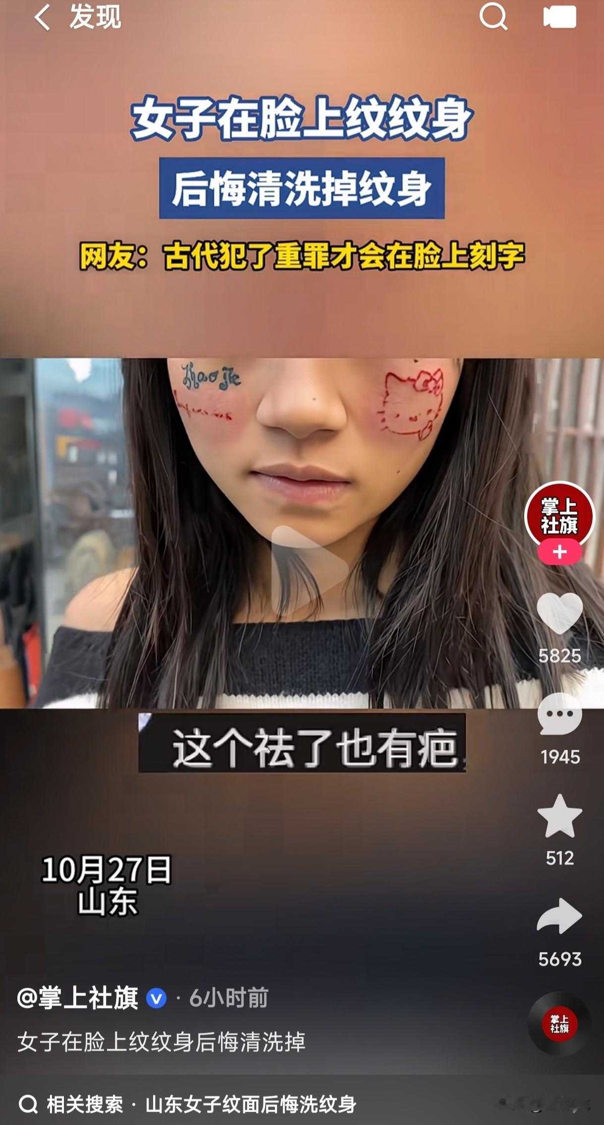 你见过在脸上纹身的吗? 山东一女子在脸上纹身清洗后也有疤痕,这到底是纹身师太缺德了?还是女子当初年少无知不懂事? 在脸上纹身无疑和毁容有什么区别?这纹身师真是哪里都敢纹,为了挣钱真是没有一点道德底线,你就是给她纹在屁股蛋子上也总比纹在脸上强,这一辈子都清洗不掉,就是清洗掉之后也会在脸上留下疤痕,这不是眼睁睁的看着她毁容吗? 这女子当初不知是咋想的?别人都在其它部位纹身,她竟然在脸上纹身,这是为了显得好看,还是觉得与别人与众不同,这不是活脱脱滴自己作贱自己吗?面部清洗纹身 纹身图案清洗 刺洗纹身 刺青洗纹身