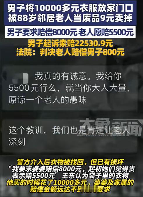 近日,成都一男子将价值一万多元的衣服打包好,放在门口等待快递员上门揽收,不料被邻居88岁的老奶奶当作废品捡走,随后以九元的价格卖给了收废品的人。   “阿姨,那是我一万五的衣服!”“我哪晓得嘛,看着像废品就拎走了。”发生在2025年4月的这段有些搞笑的对话,揭开了一出现实版“黄金当废铁”的序幕。   4月15号那天,由于急着出门,王东将打包好的衣物放在家门口。里面有—件始祖鸟冲锋衣、一条同品牌冲锋裤,还有几件其他的名牌服装,总价超过一万五千元。为了以防万一,他特意将箱子往门边靠了靠,心想快递员半小时后就会取走。   他怎么都没想到,就是这短短的半小时,88岁的张婆婆从楼上下来了。在她六十多年的节俭生活里,纸箱等于废品这个概念早已根深蒂固。见到那个捆扎整齐的包裹,她自然而然地拎起来,慢慢走向小区门口收废品的地方。   “今天这个纸箱不错,挺沉。”她接过这些衣服称斤卖出的九元钱,转身就去买菜了,整个过程就像过去千百次卖废品一样平常。   张婆婆的儿媳李芳是个明事理的人,得知婆婆把邻居的价值万元的衣物当废品卖了,立刻冲向废品回收站。幸好,对方还没来得及将废品转运,那些昂贵的衣服还在,只是有些不同程度的受损。   “真的很抱歉,我婆婆年纪大了,她真的不知道。”李芳捧着找回的五件衣物,连连道歉。王东也理解老人的无心之失,但这些衣服的损失对他而言不是小数目。   于是,他提出八千元的赔偿方案,李芳则认为衣服已经找回大部分,考虑到折旧,愿意赔偿5500元。双方在赔偿金额上僵持不下,只好闹上了法庭。   王东提供了完整的购买记录:始祖鸟冲锋衣3439元,冲锋裤2199元,和其他衣物加起来确实超过一万五千元,再加上误工费和精神损失费,一共索赔22530.9元。   法庭上,张婆婆一直低着头。“我真的不是故意的,”她反复说着这句话,“在我们那个年代,衣服哪有这么贵的。我看着捆得整整齐齐放在门口,就以为是不要的。”   法官理解老人的困惑,但也明确指出:把别人放在家门口的物品擅自取走,无论动机如何,都构成了民事侵权。因此,法院在2025年9月作出判决:张婆婆赔偿王东800元。   这个数字是基于张婆婆年事已高,其行为确实存在主观过错,但考虑到衣物已追回且使用过,应当酌情减轻赔偿。更重要的是,王东将贵重物品长时间放置在公共区域,自身也存在保管不当的过失。   在这个物质丰裕的时代,老一辈人靠着“像废品”这样的经验法则生活,而年轻人则习惯了将价值数千元的物品随手放置。双方都没有错,只是认知不同。   这九块钱的废品,八百元的赔偿,给所有人都上了一课:时代在变,邻里间多一分留心,就少一分闹心。毕竟,谁家门口都可能放着看不见的价值,也都住着看不见的隔阂。   信源: 大象新闻 ——10月25日(报道)四川成都,男子将一万多衣服放家门口,被88岁邻居老人当废品9元卖掉,男子要求赔偿8000元 老人愿赔5500元,男子起诉索赔22530.9元,法院:判决老人赔偿男子800元   文│一阳 编辑│史叔