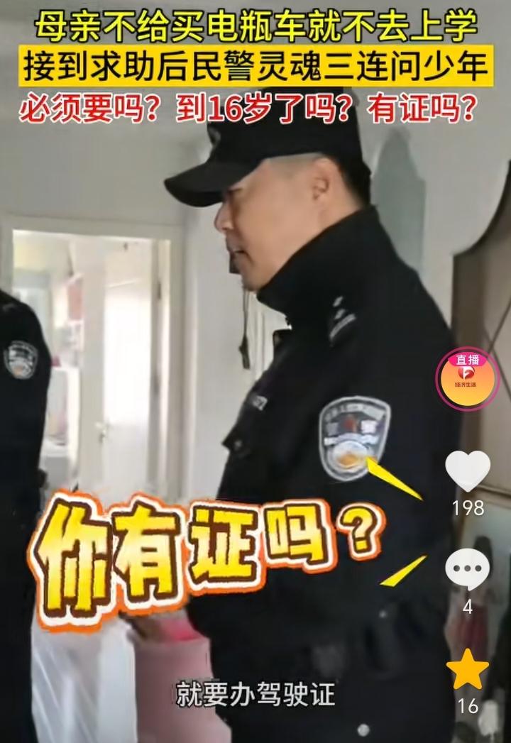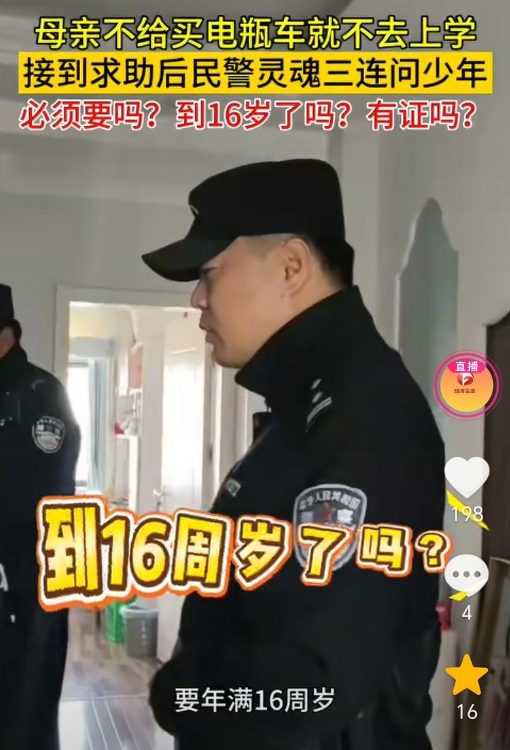 浪费警力资源!安徽凤台,孩子要求母亲给买电瓶车不买就不上学,母亲报警求助,民警上门后对孩子灵魂拷问,老师规定必须要骑电瓶车吗?你满16岁了吗?你有驾驶证吗?一连串的问题孩子无法回答,结果来了一句校车太慢,民警回应孩子,校车慢但是安全,要么你可以起早些骑自行车或者坐公交车,最终在民警的劝说下,孩子认识到了自己的错误并承诺返校。 看完视频后,我的第一想法就是,这母亲做的简直太失败了,就为了孩子不买电瓶车就不上学去报警,真是浪费警力资源,退一步讲来就算这次报警成功劝了孩子,那么以后怎么办?不可能每次都去报警吧?所以说这就不是解决问题的最好办法。 孩子会出现这种情况根源还是在于家长,都是家长惯坏了的,没有从小给孩子树立正确的三观,导致了孩子叛逆不听话。 孩子小的时候不听话可以打,但是孩子大了就不一样了,这个时候就应该多和孩子沟通,多给讲道理谈利弊,不要为了这点小事就去报警解决,就算解决了当前问题也解决不了以后的问题。对此,大家觉得呢?